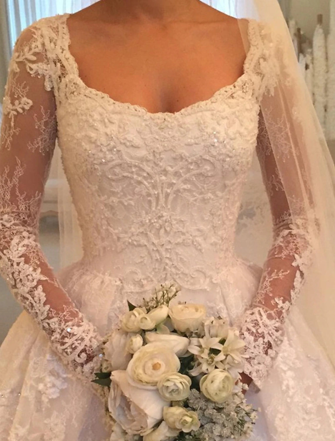Engagement Formal Fall Wedding Dresses Ball Gown Illusion Neck Long Sleeve Chapel Train Lace Bridal Gowns With Buttons Pearls