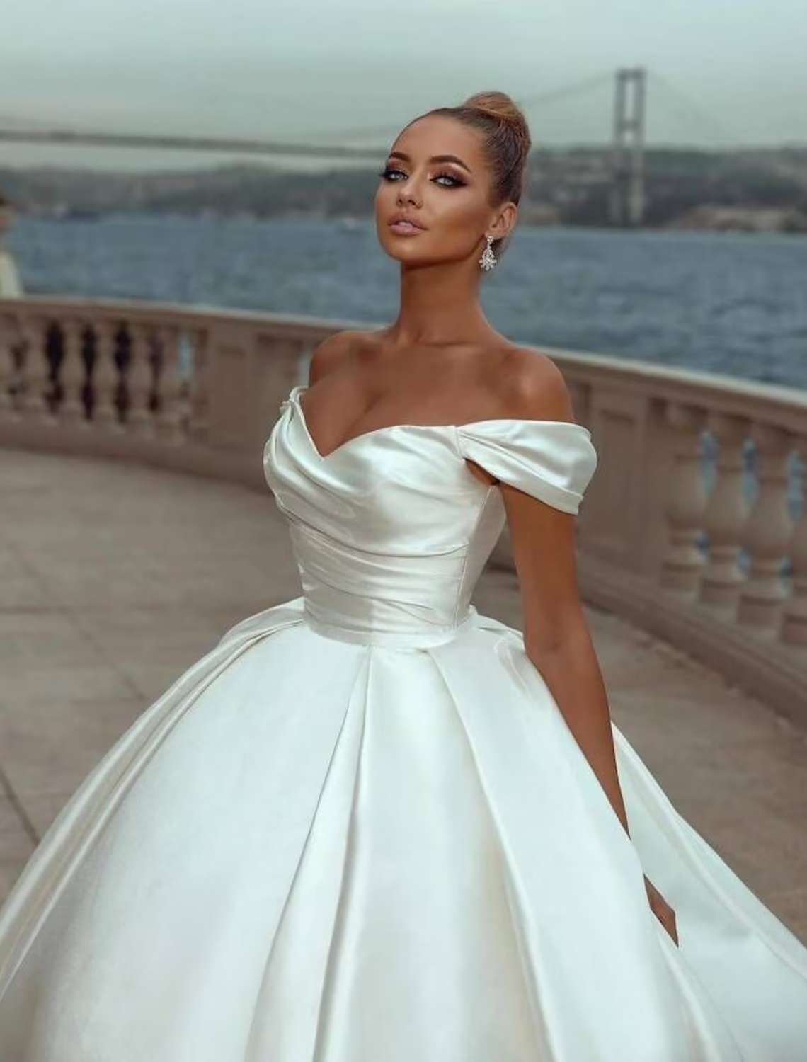 Engagement Formal Wedding Dresses Watteau Train Ball Gown Sleeveless Off Shoulder Satin With Ruched Solid Color