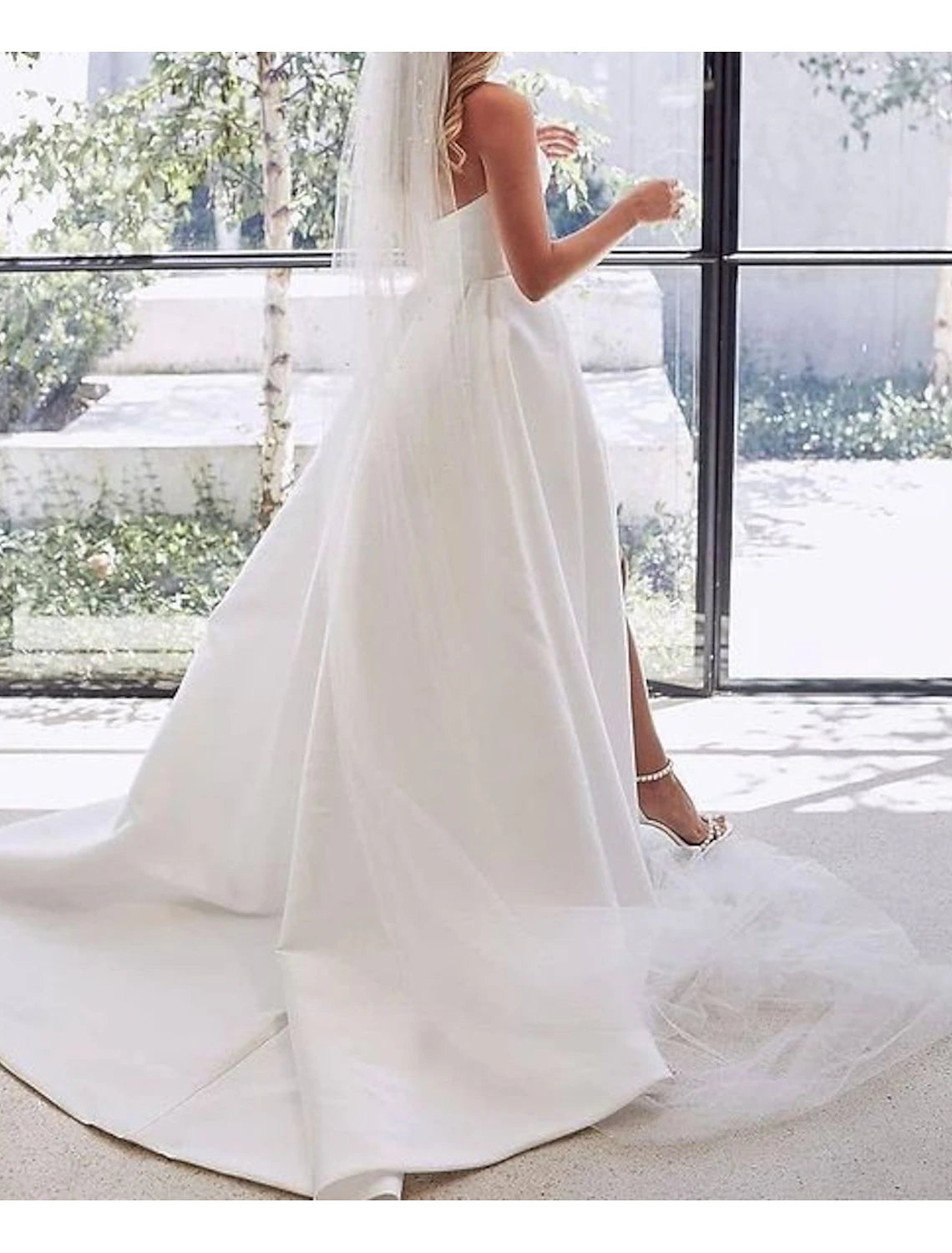 Engagement Sweetheart Strapless Court Train Satin Bridal Gowns With Split Front Wedding Dresses