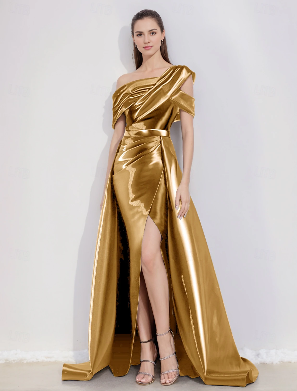 Evening Dress A-Line Formal Christmas Floor Length Short Sleeve One Shoulder Pocket Satin Glitter Elegant Fall November December Wedding Guest Dress