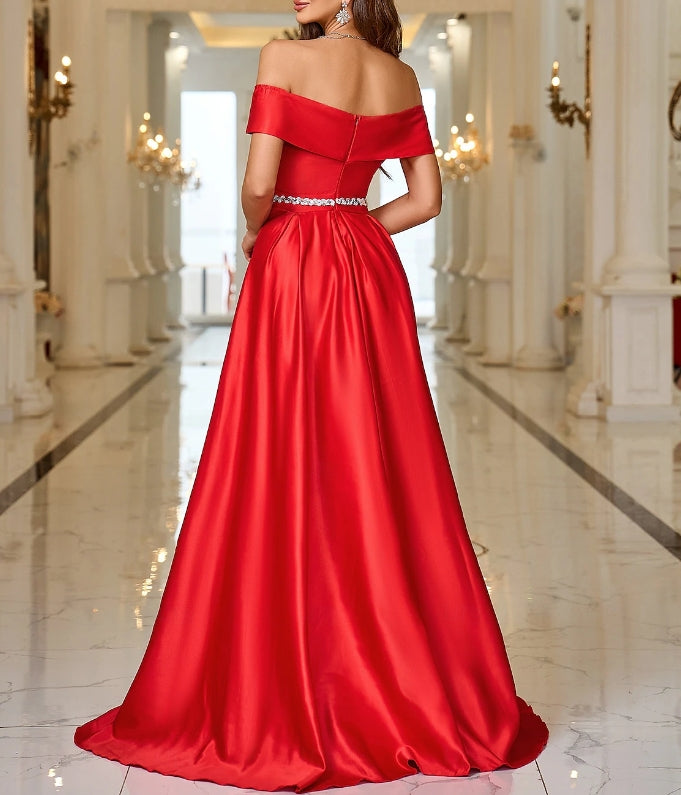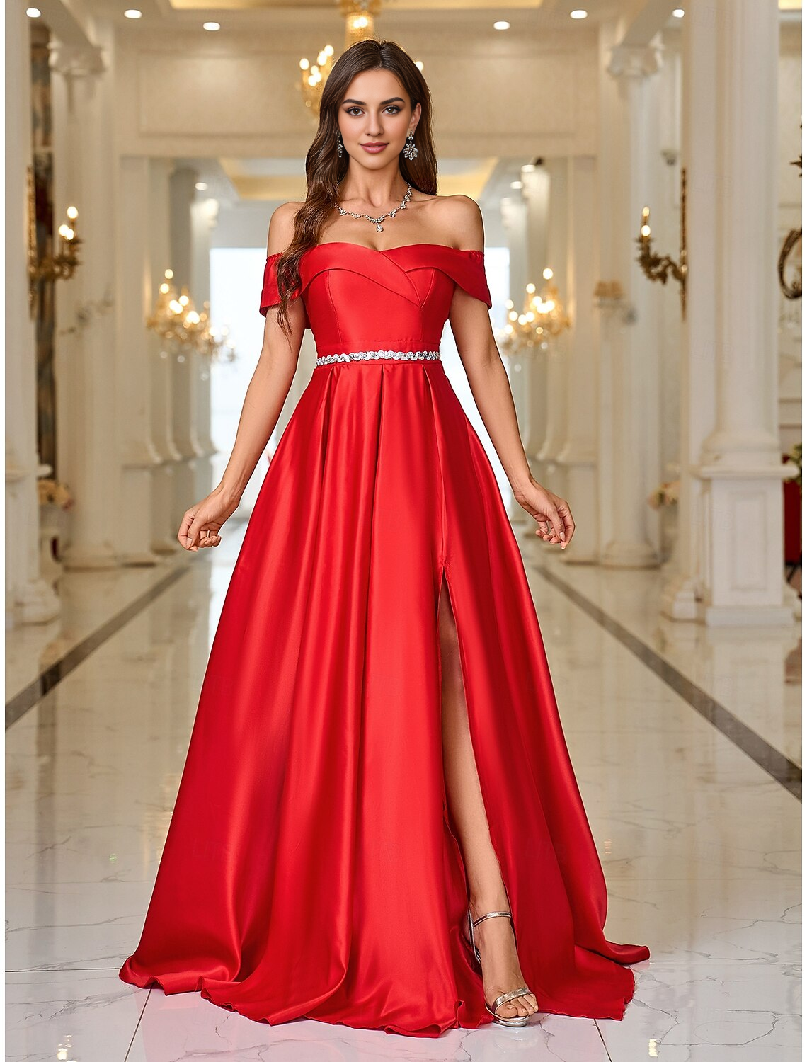 Evening Dress A-Line Formal Christmas Sweep Train Long Sleeve Off Shoulder Pocket Satin with Rhinestone Elegant Fall November December Wedding Guest Dress