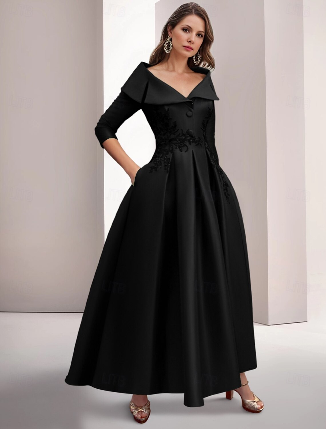 Evening Dress A-Line Gown Embroidered Vintage Christmas Dress Formal Floor Length 3/4 Length Sleeve Shirt Collar Satin Appliques Elegant Fall November December Wedding Guest Dress