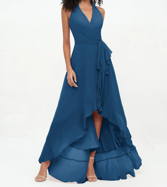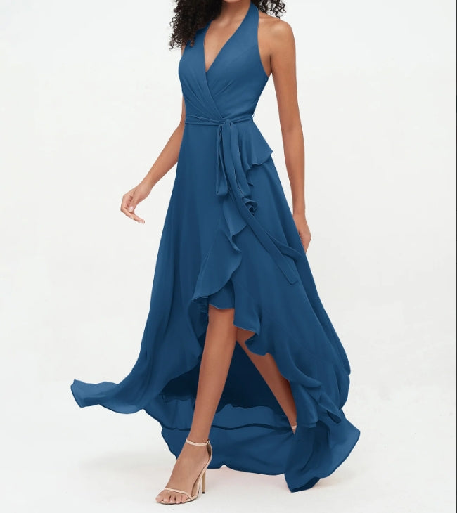 Evening Dress Halter Deep V Neck Chiffon Asymmetrical Dresses
