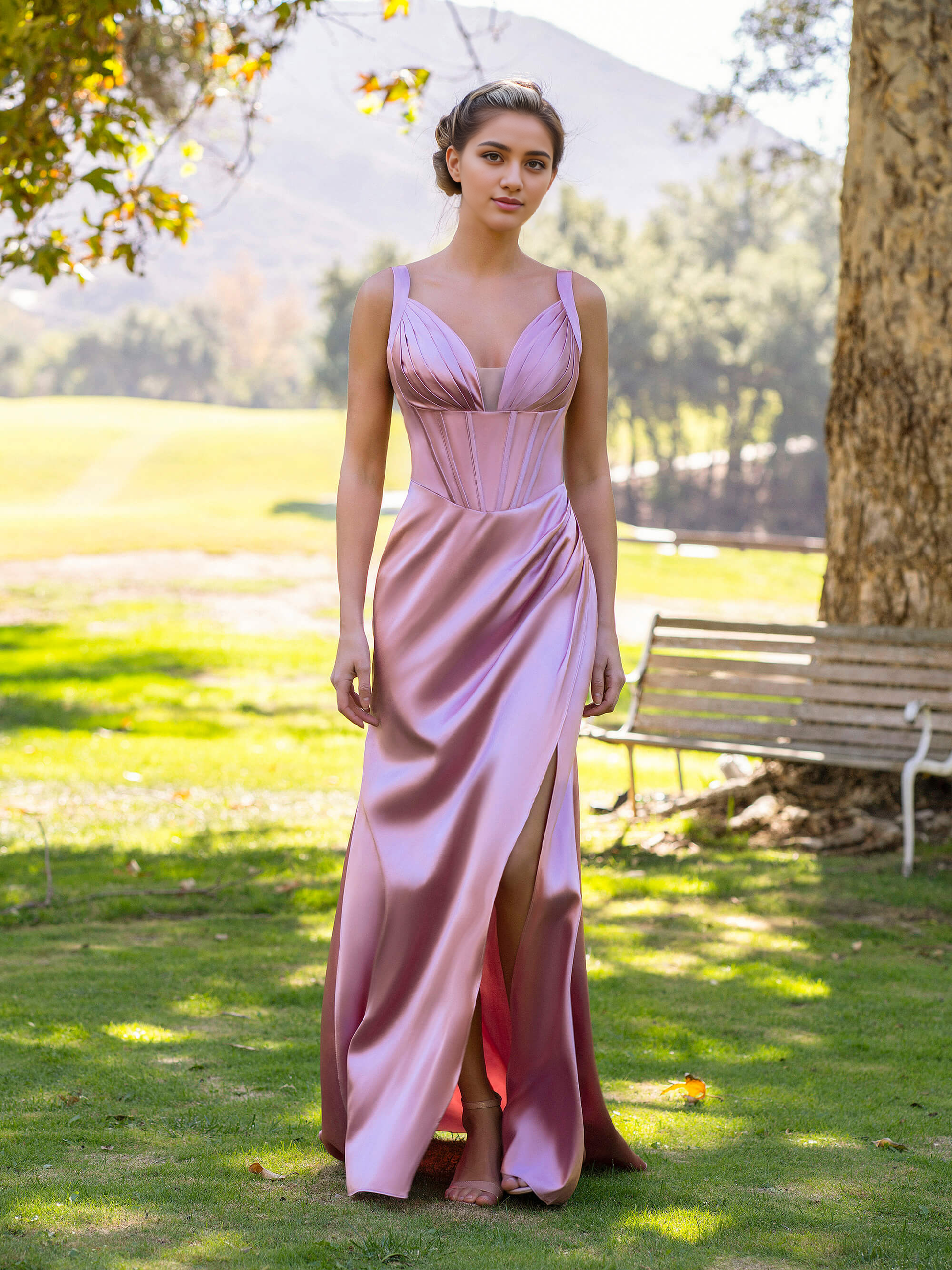 Evening Dress Sheath Pink V-neck Satin Floor Length Prom Dress Side Fork Exquisite Elegant Formal Women's Dresses
