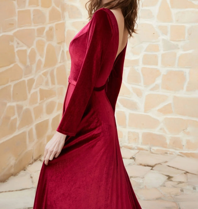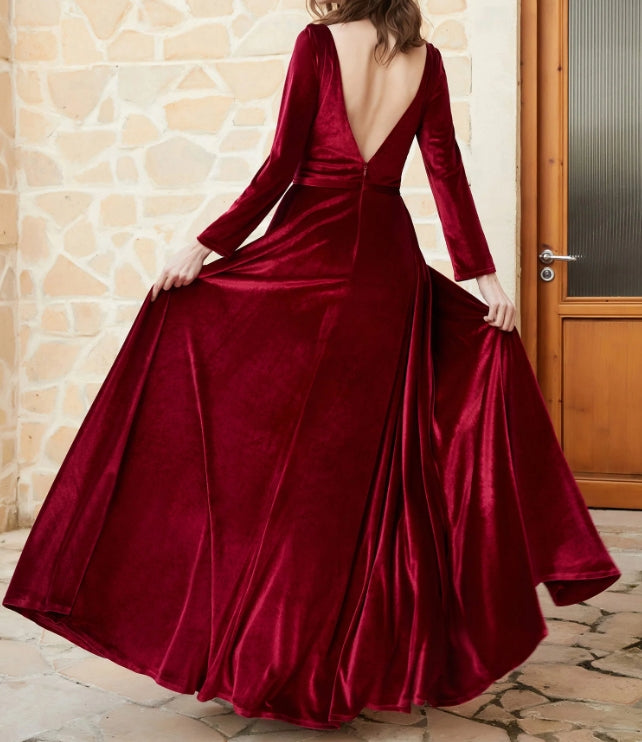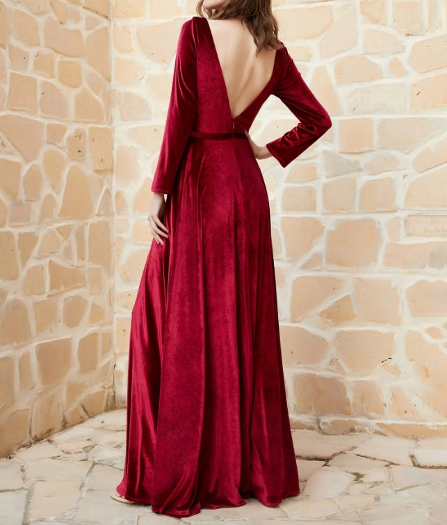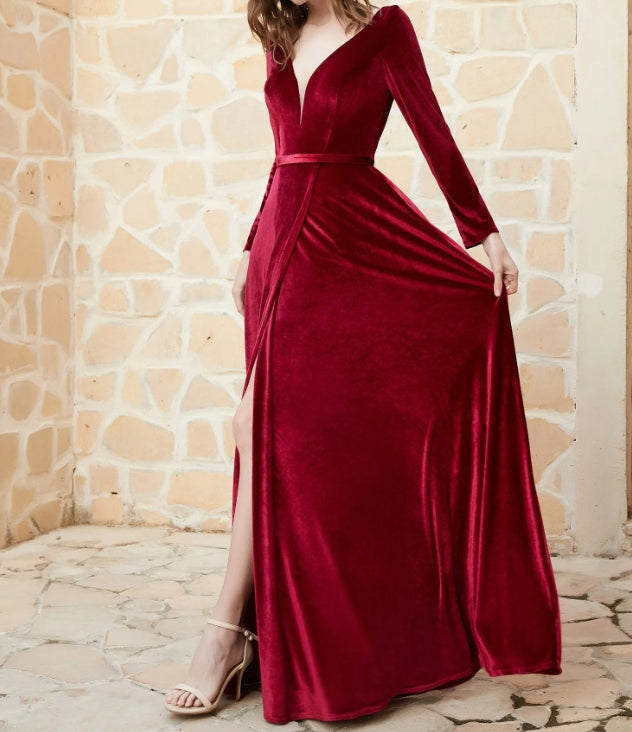 Evening Dress V-Neck Velvet Dress Long Sleeves Plunging With Slit
