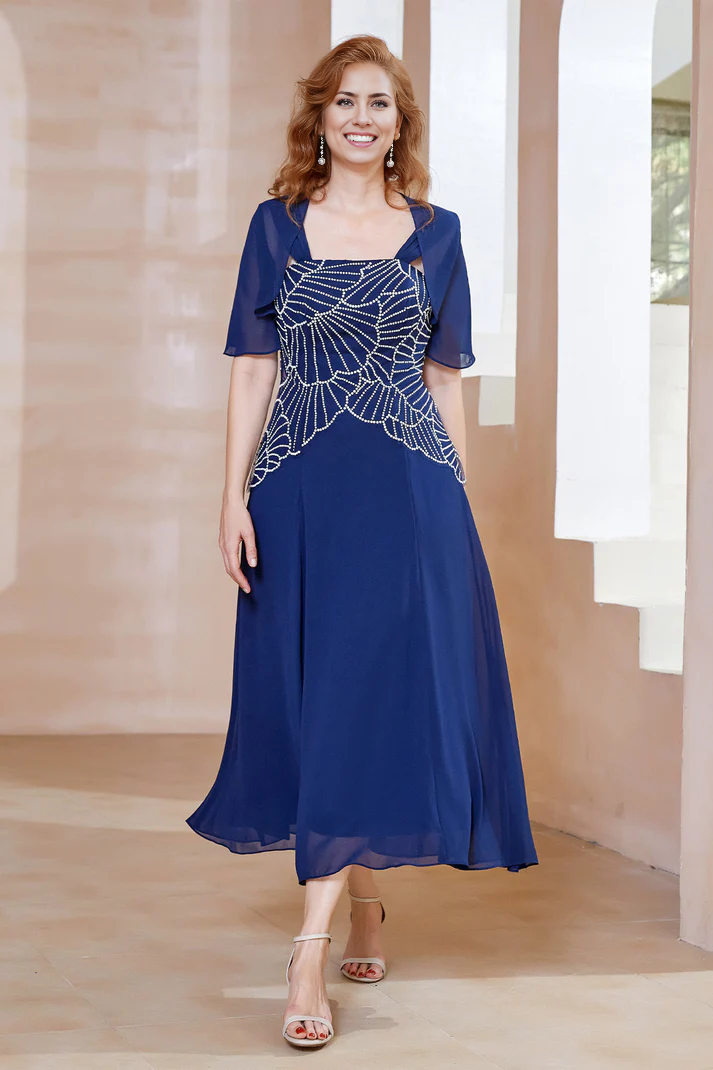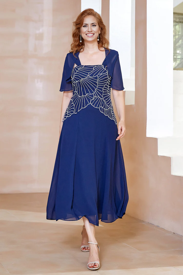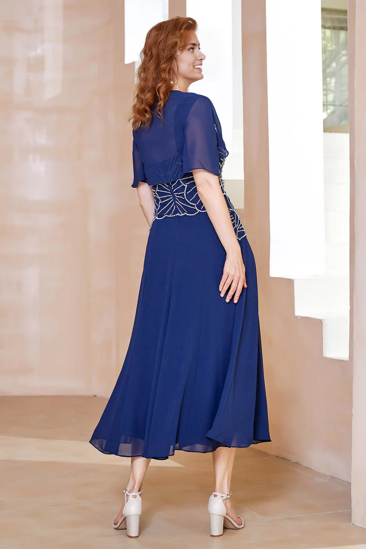 Fall November December Wedding Guest Dress Beaded A-Line Short Sleeves Chiffon Dress Mother of the Groom/Bride Dresses