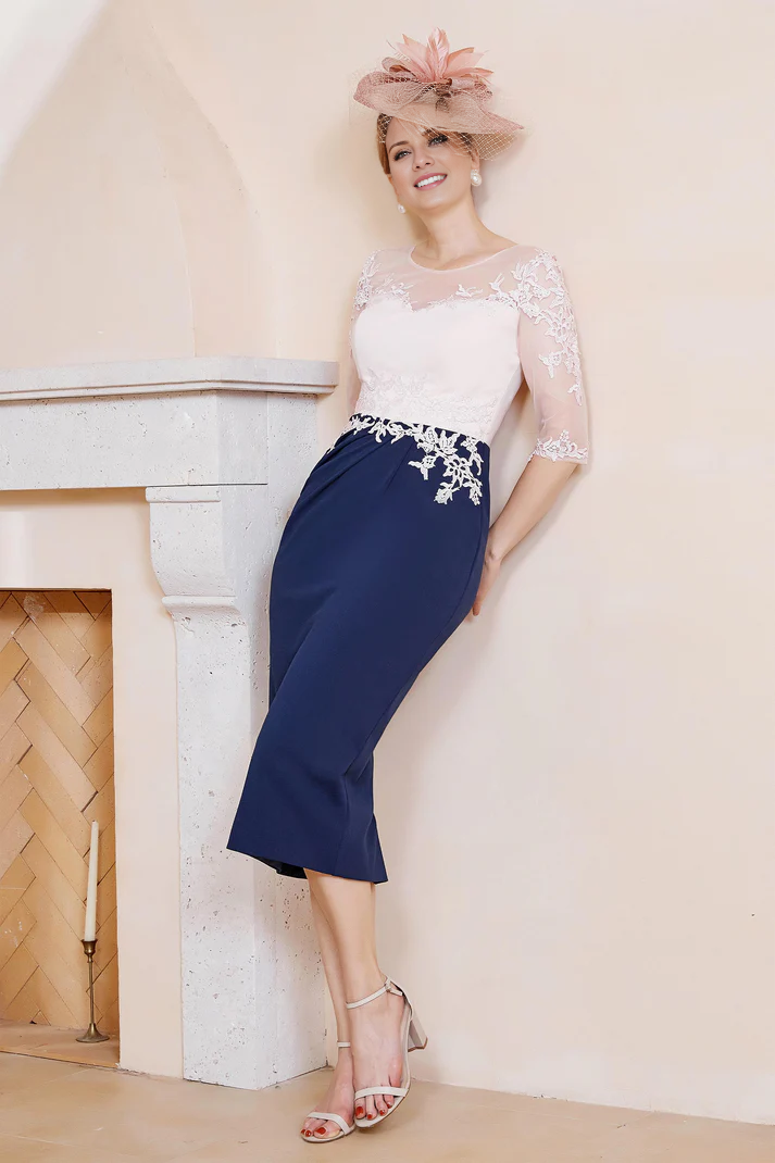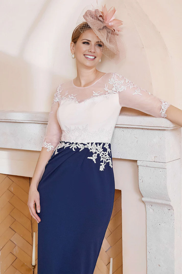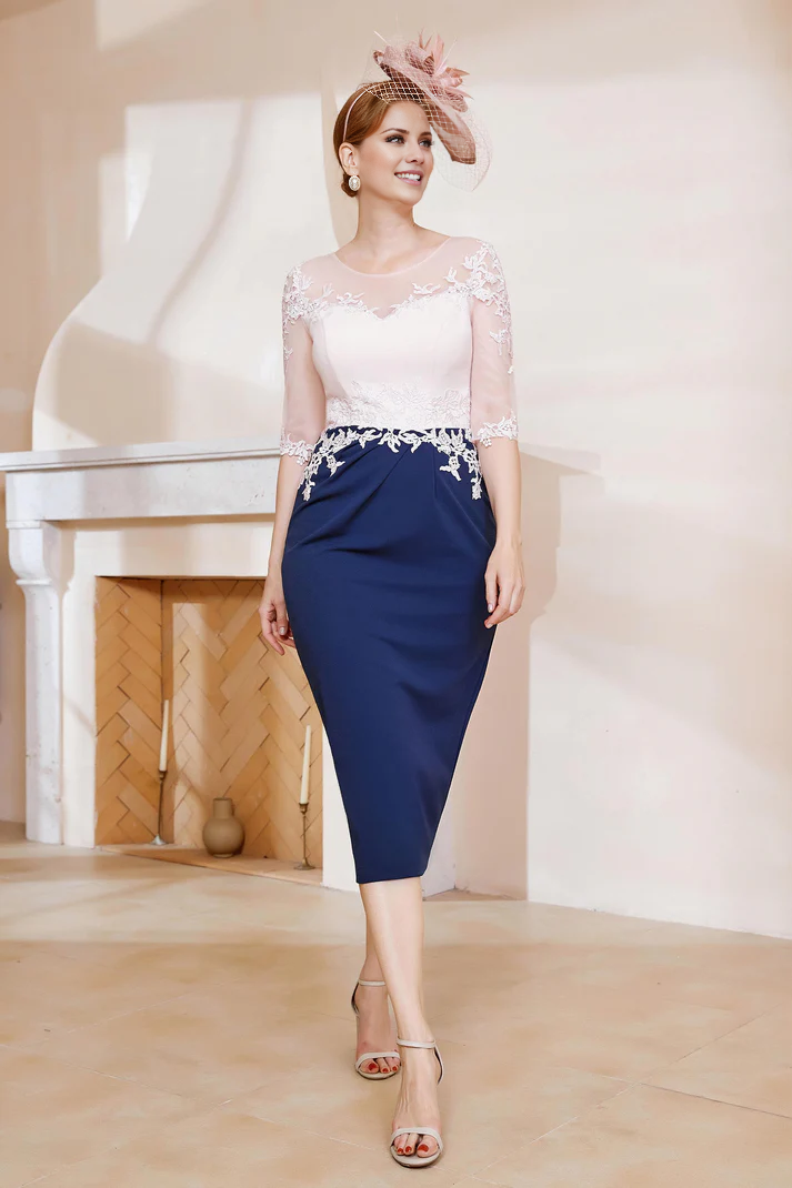 Fall November December Wedding Guest Dress Illusion Neck Lace Applique Half Sleeve Tea-Length Gown Mother of the Groom / Bride Dresses