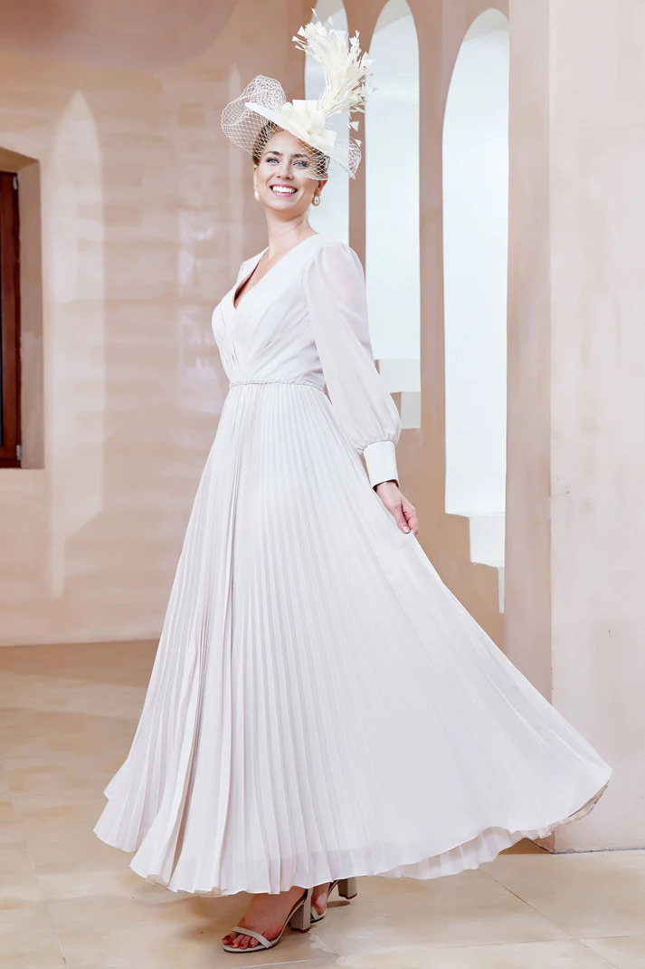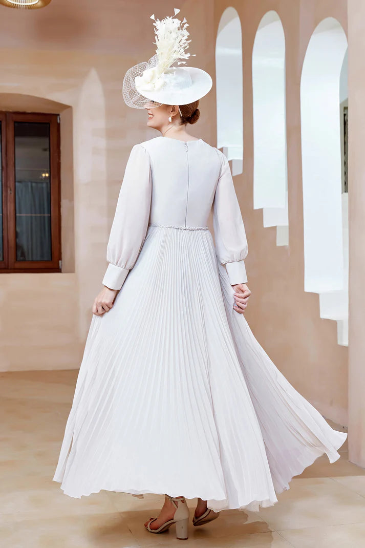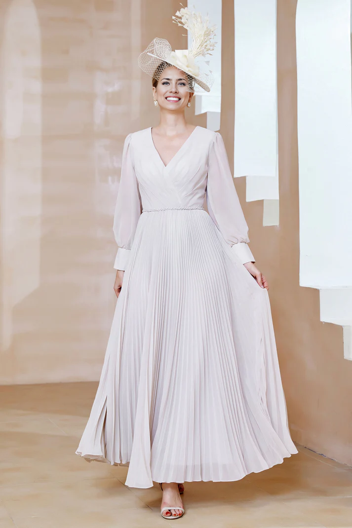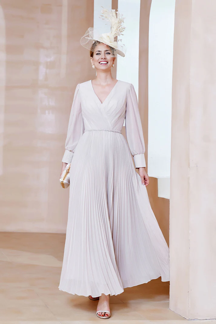 Fall November December Wedding Guest Dress V-Neck Long Sleeves Pleated Long Dress Mother of the Groom/Bride Dresses