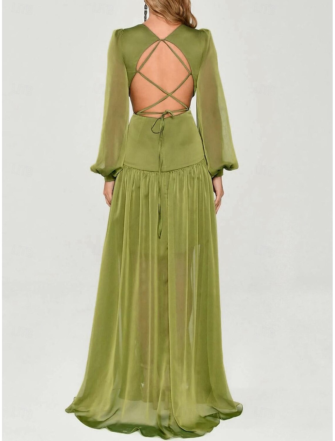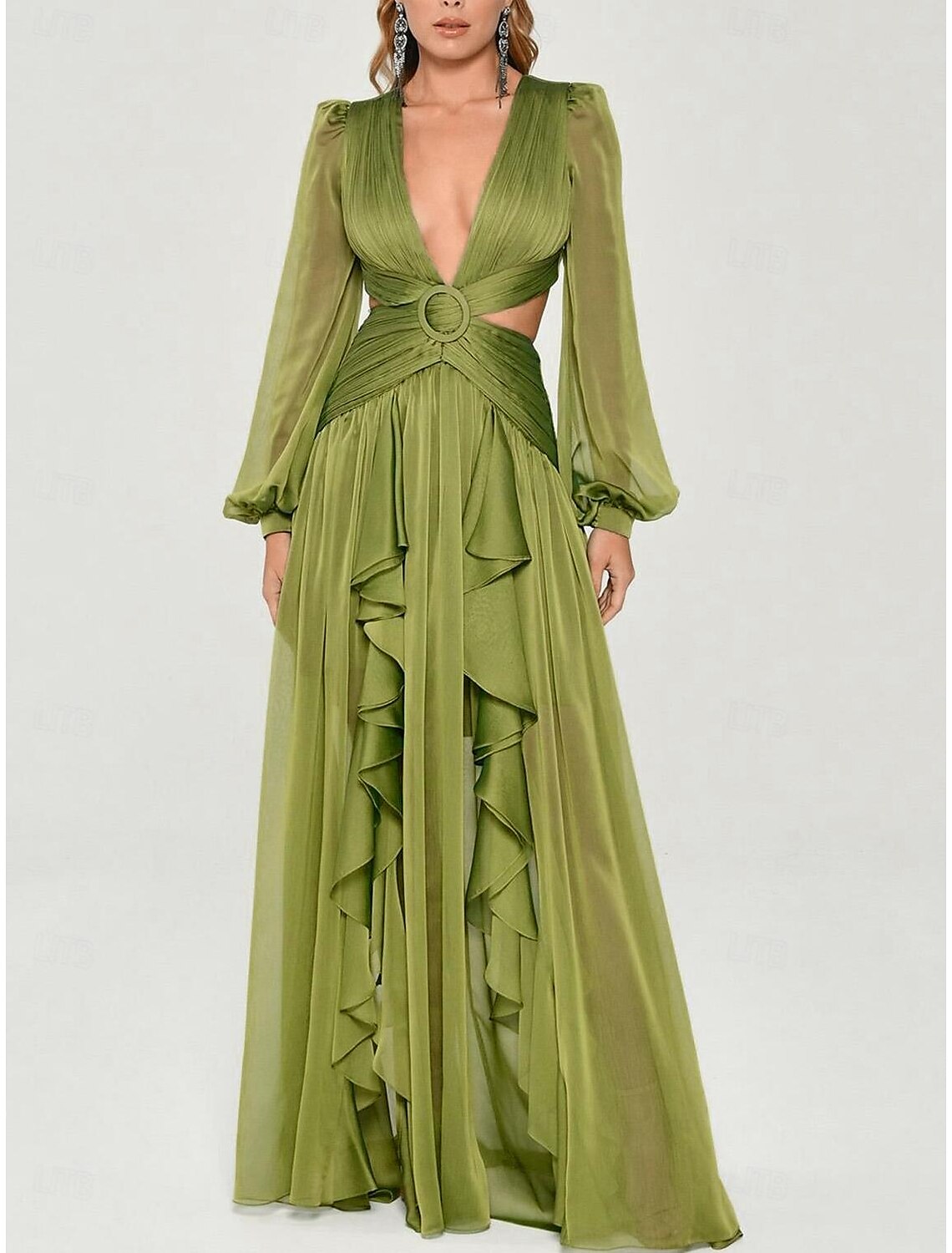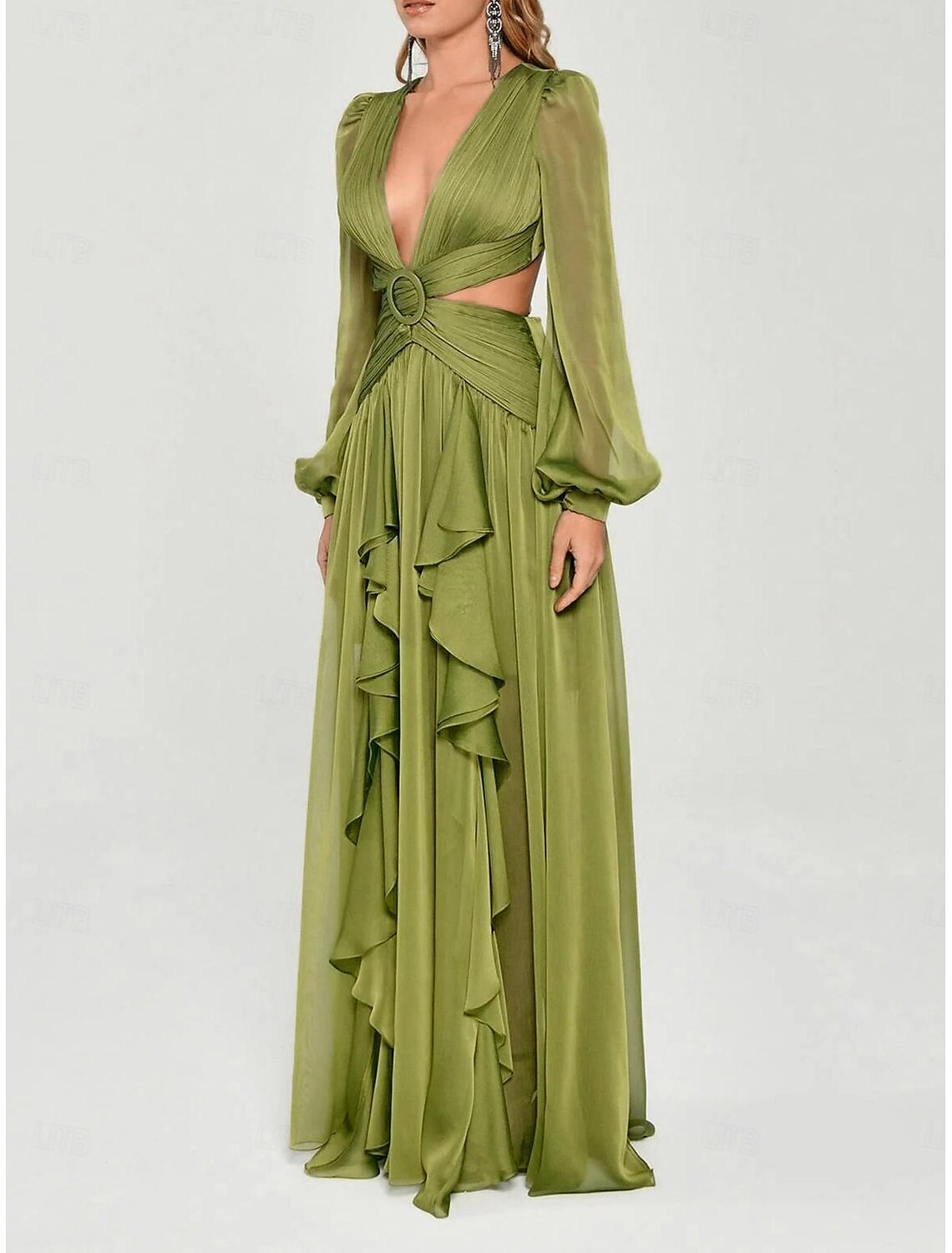 Gown Elegant Formal Fall Floor Length Long Sleeve V Neck Chiffon Back with Criss Cross Ruffles Evening Dress