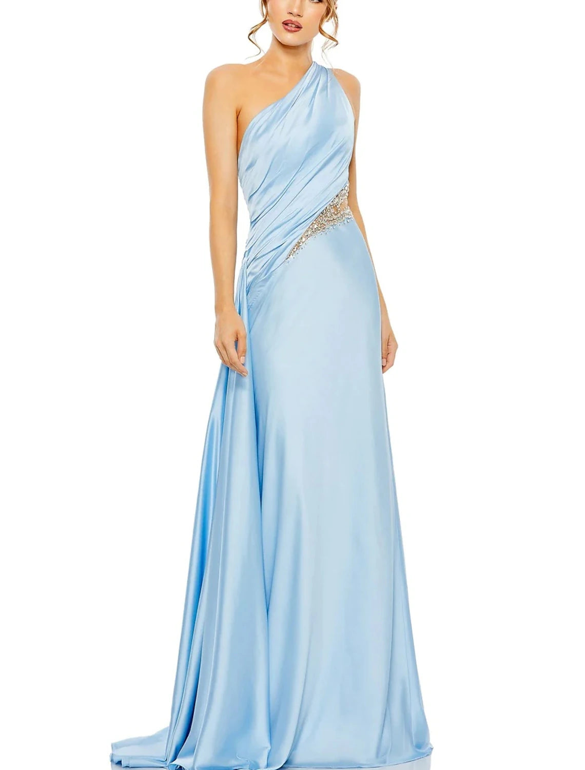 Gown Elegant Formal Floor Length Sleeveless One Shoulder Satin with Glitter Ruched Sequin Evening Dress