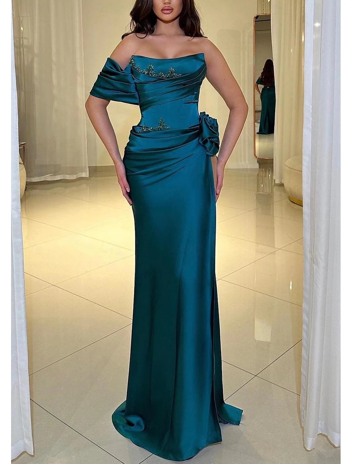 Gown Elegant Formal Floor Length Sleeveless Strapless Satin with Rhinestone Slit Evening Dress