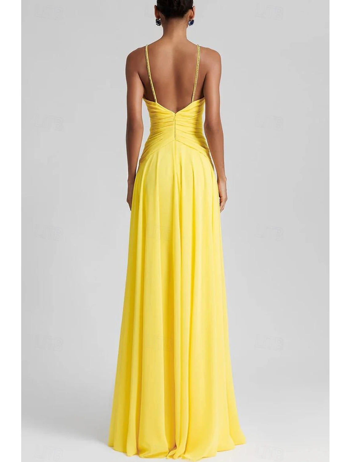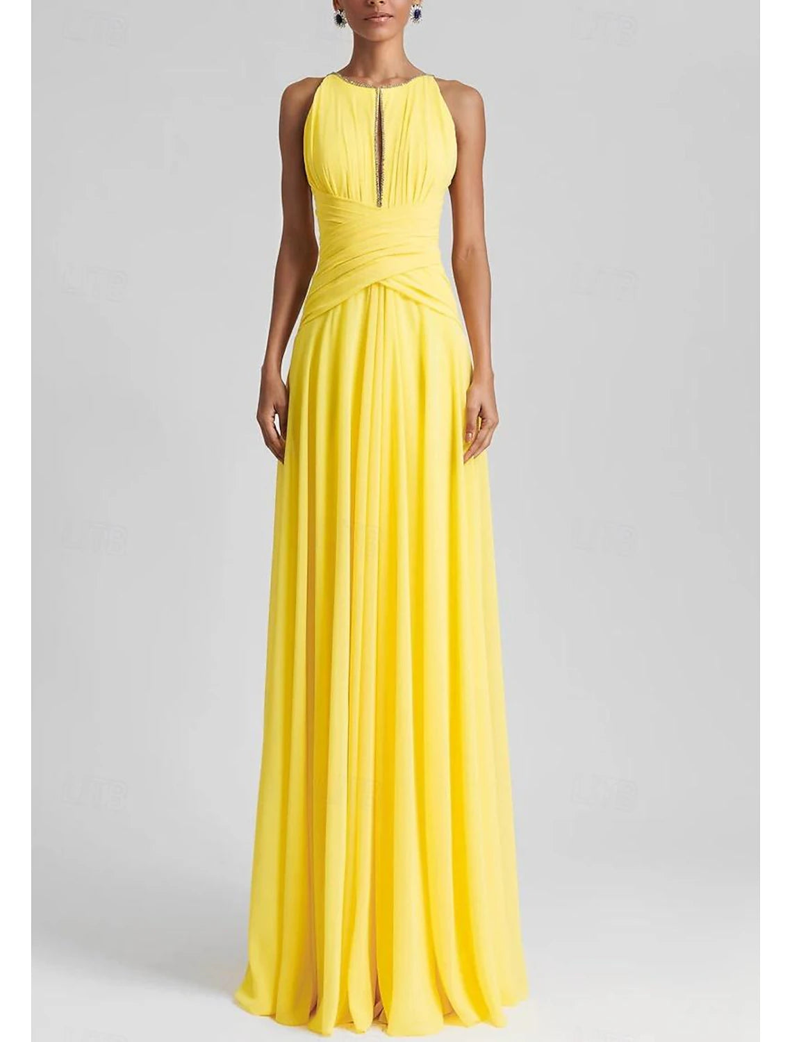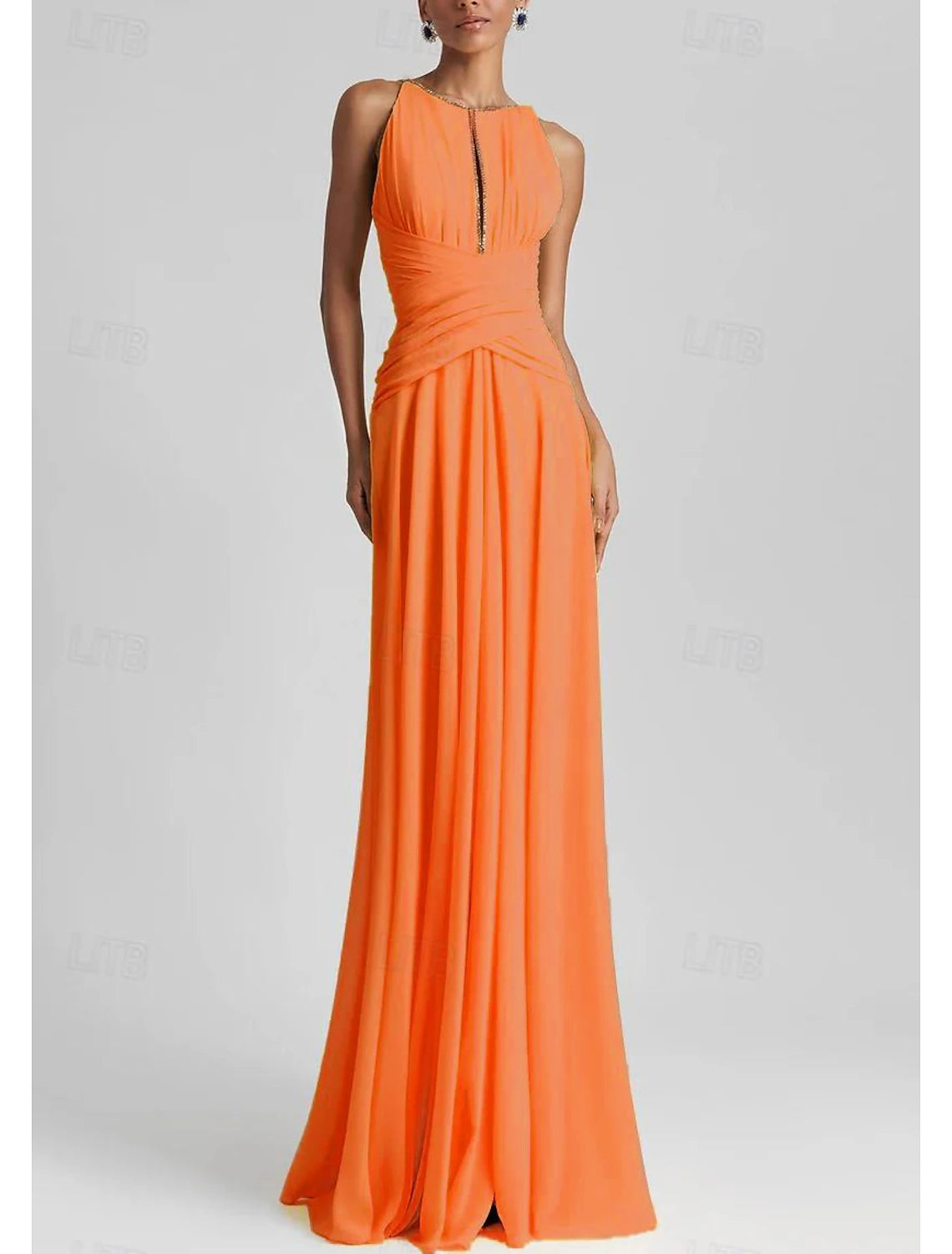 Gown Elegant Formal Wedding Guest Floor Length Sleeveless Jewel Neck Chiffon with Rhinestone Glitter Pleats Evening Dress