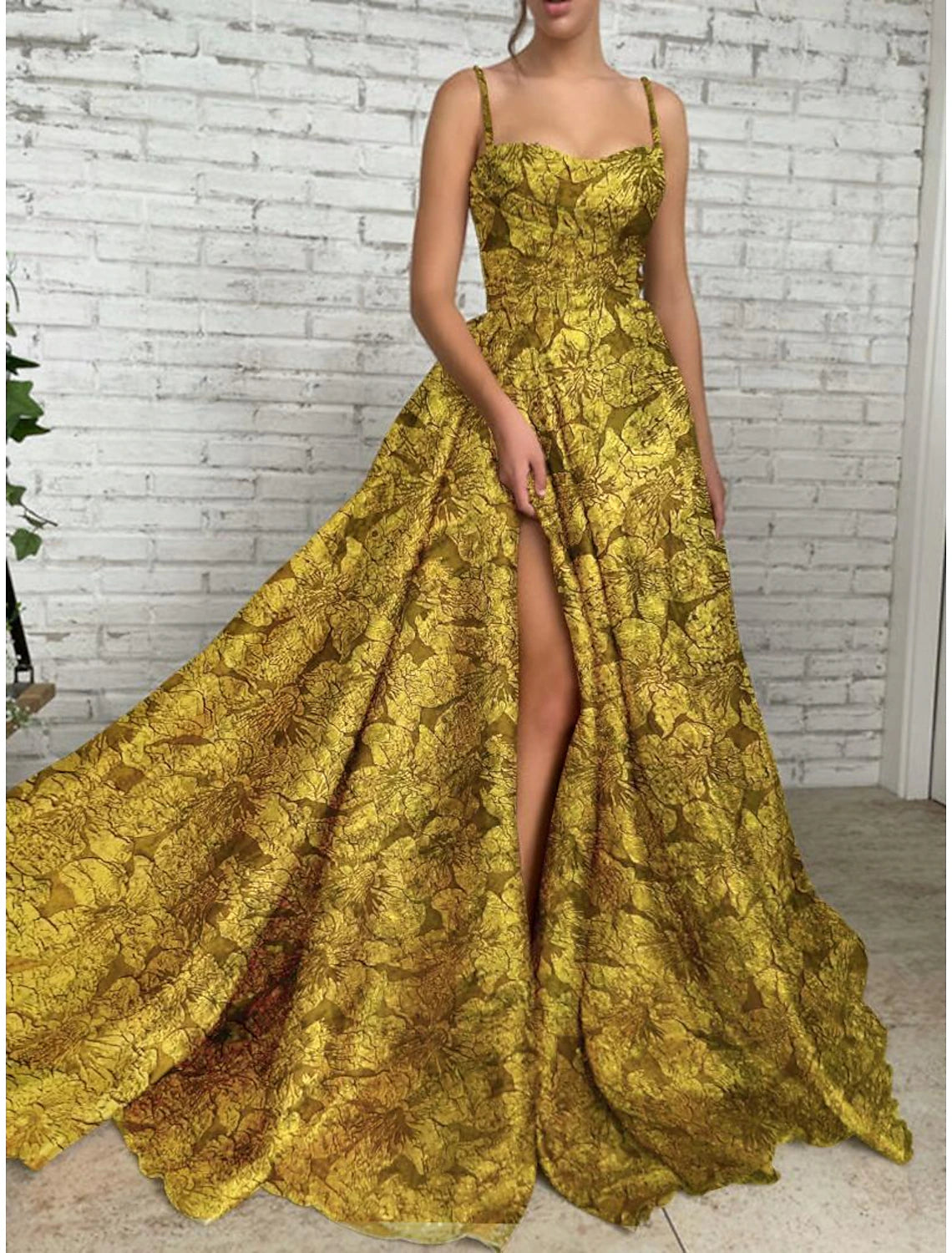 Gown High Split Formal Dress Court Train Sleeveless Spaghetti Strap Sequined with Glitter Pleats Ruched Evening Dress