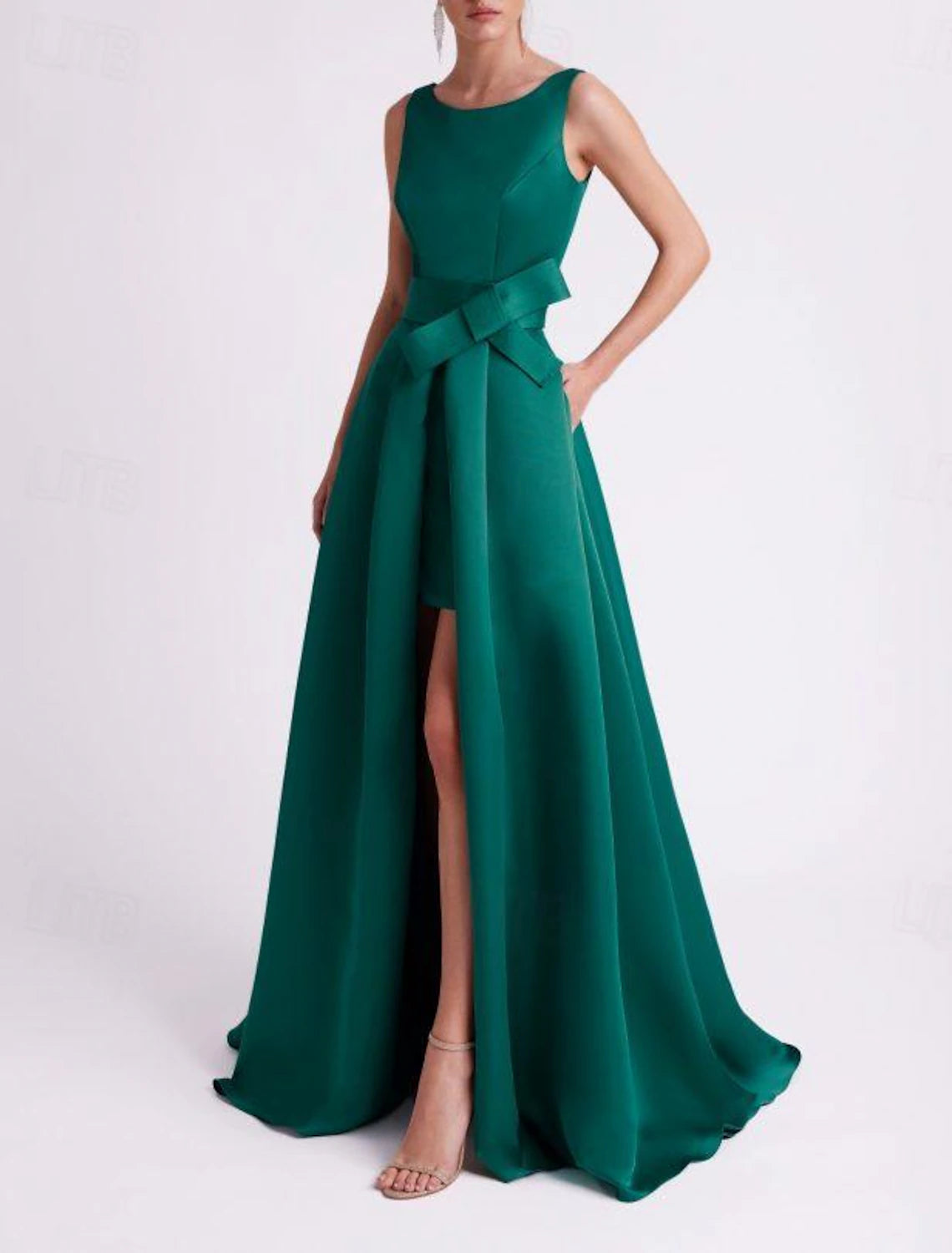Gown High Split Formal Wedding Guest Floor Length Sleeveless V Neck Belt / Sash Satin with Slit Evening Dress