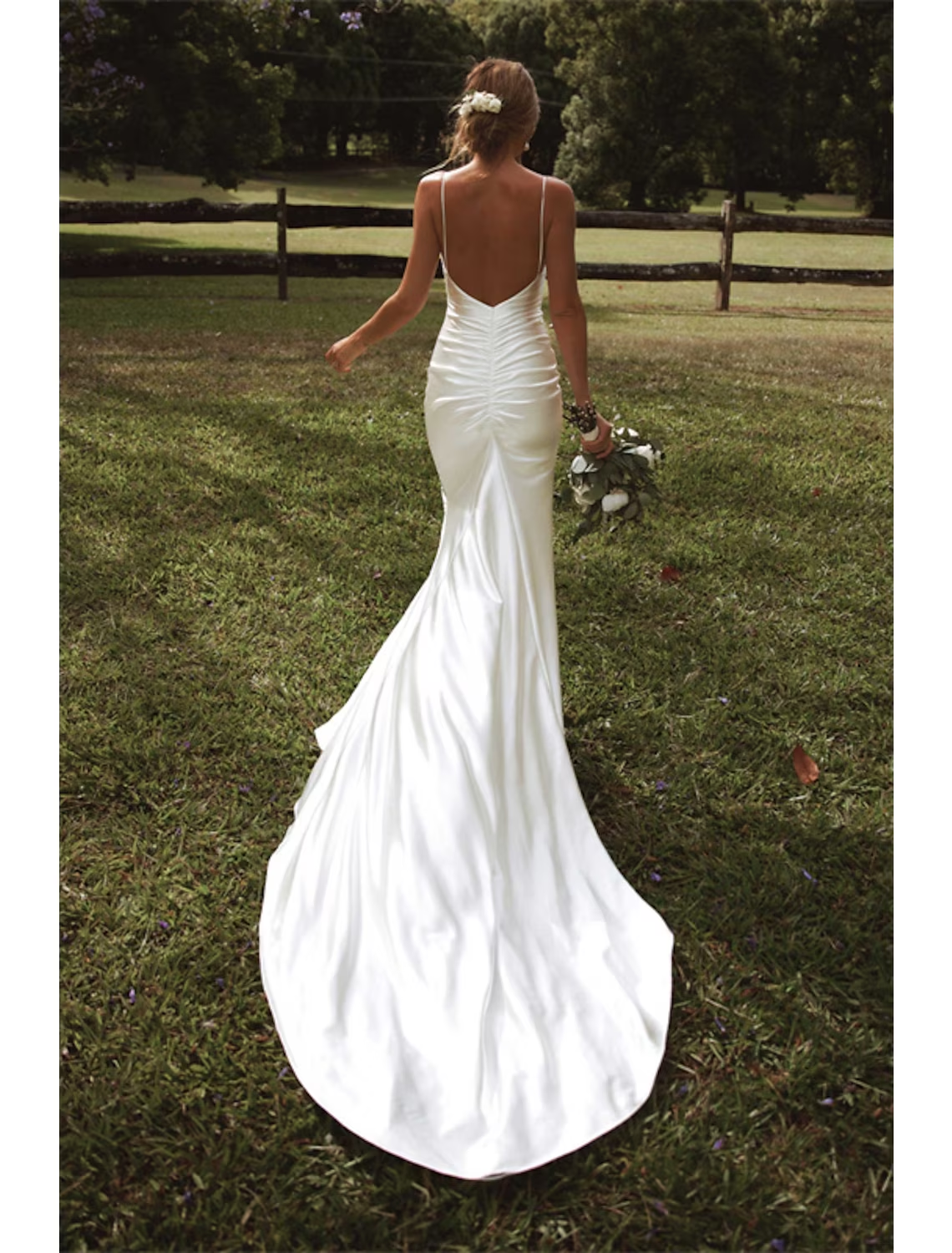 Hall Casual Wedding Dresses Court Train Mermaid / Trumpet Sleeveless Spaghetti Strap Jewel Neck Satin With Ruched Split Front