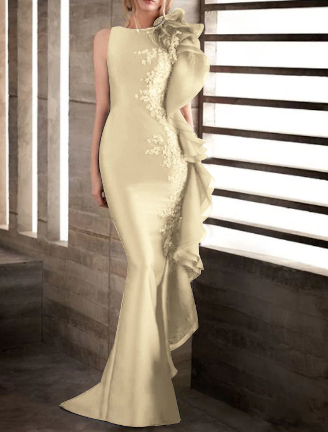 Mermaid / Trumpet Evening Gown Beautiful Back Dress Engagement Formal Evening Sweep / Brush Train Sleeveless Jewel Neck Fall Wedding Guest Stretch Satin with Appliques