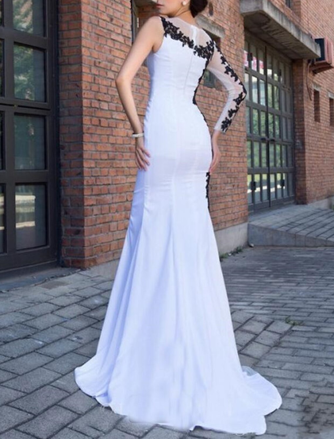 Mermaid / Trumpet Evening Gown Color Block Dress Formal Wedding Guest Court Train Long Sleeve One Shoulder Stretch Fabric with Appliques