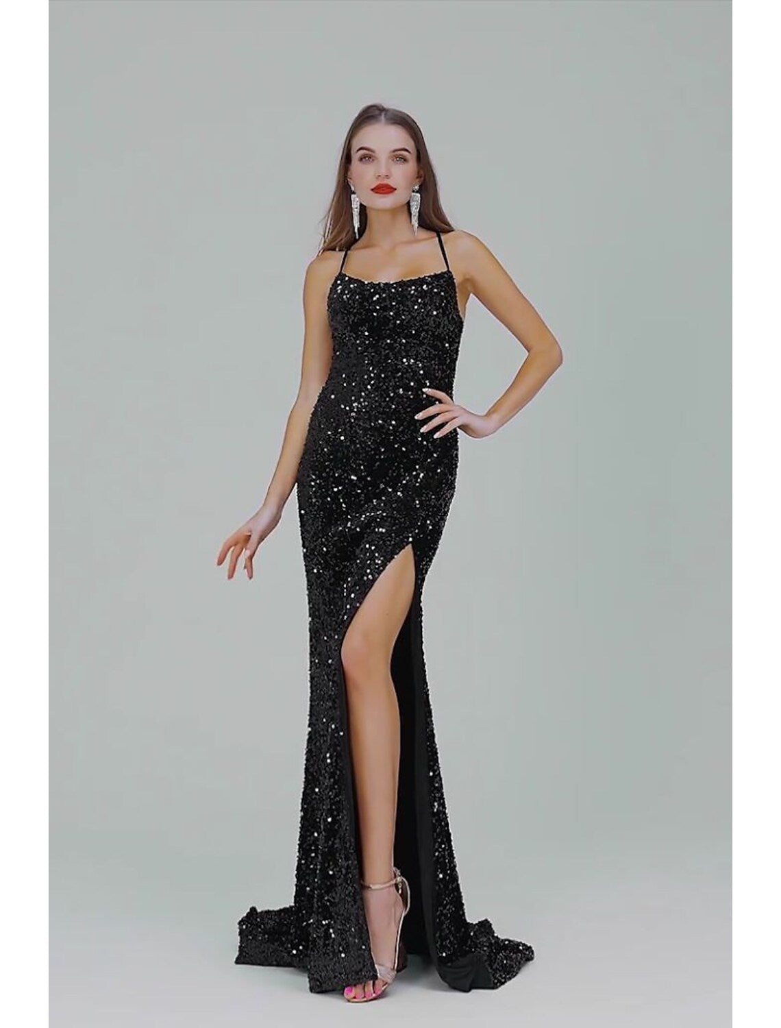 Mermaid / Trumpet Evening Gown Elegant Dress Party Wear Court Train Sleeveless Spaghetti Strap Lace Crisscross Back with Sequin Slit