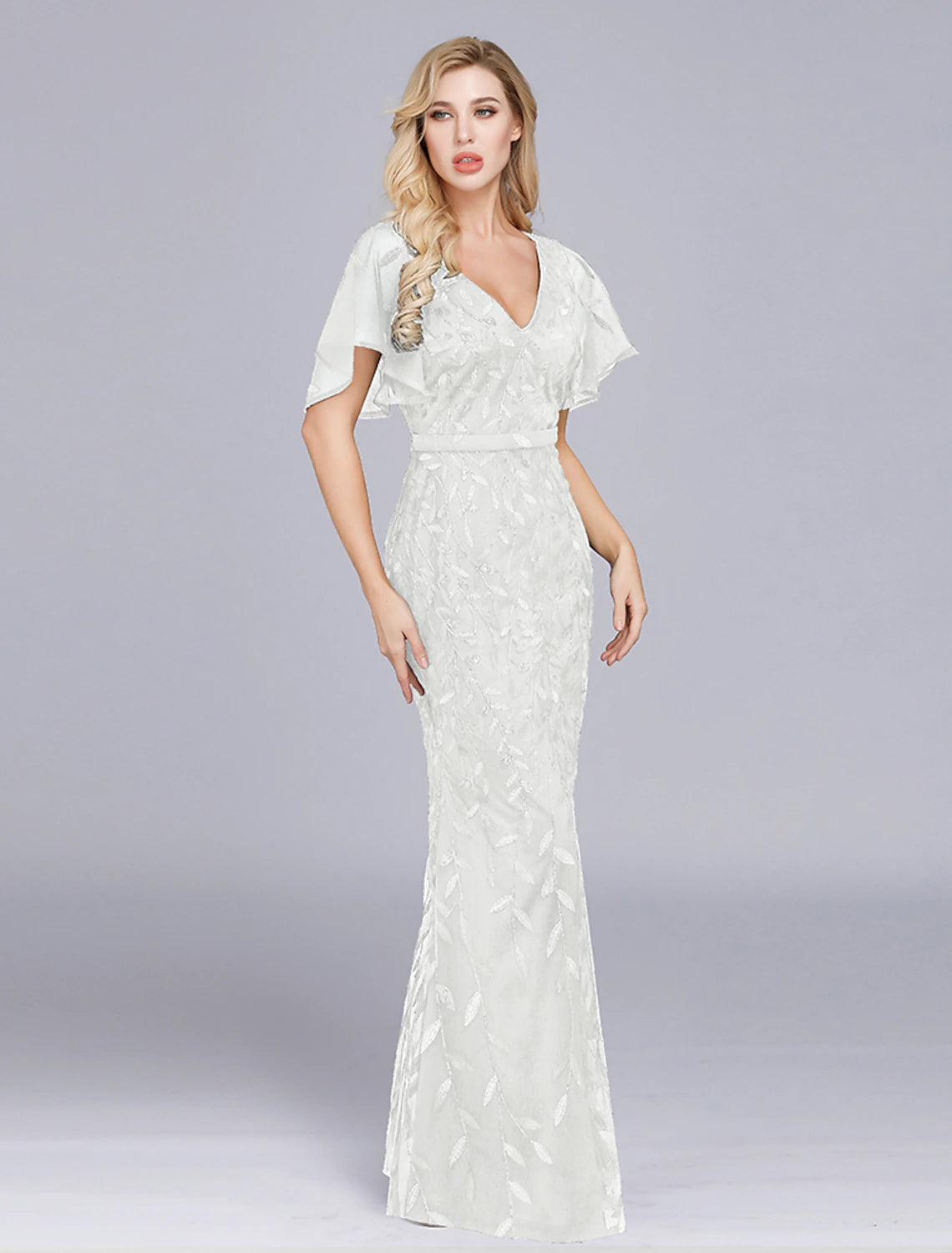 Mermaid / Trumpet Evening Gown Empire Dress Party Wear Formal Evening Floor Length Short Sleeve Jewel Neck Tulle with Ruffles Embroidery