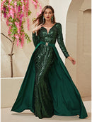 Mermaid / Trumpet Evening Gown Sparkle & Shine Dress Formal Wedding Sweep / Brush Train Long Sleeve V Neck Detachable Polyester with Sequin Overskirt