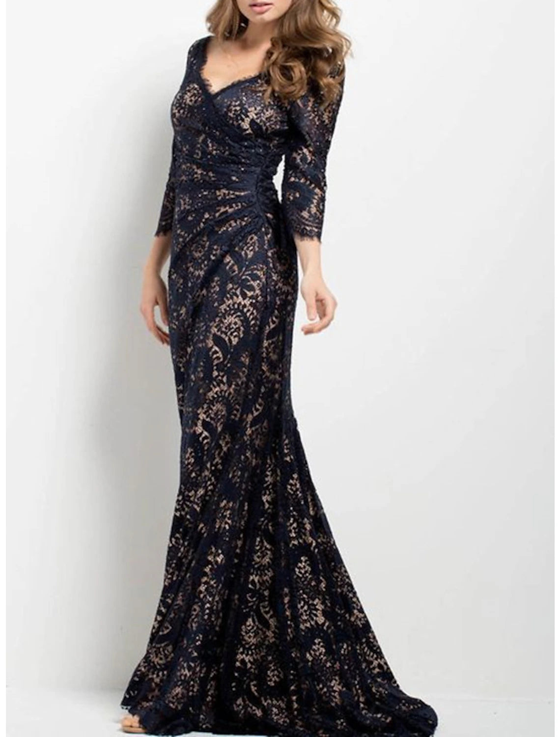 Mermaid / Trumpet Mother of the Bride Dress Wedding Guest Elegant V Neck Sweep / Brush Train Lace Long Sleeve No with Ruched Appliques