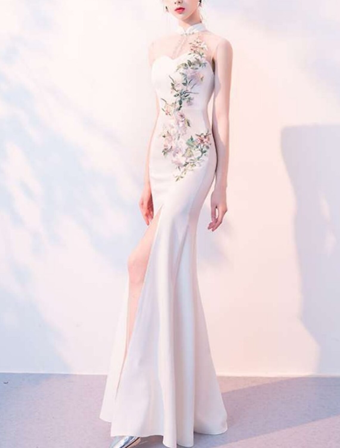 Mermaid / Trumpet Mother of the Bride Dress Wedding Guest Vintage Elegant Petite High Neck Floor Length Tulle Stretch Fabric Sleeveless with Sequin Embroidery Split Front