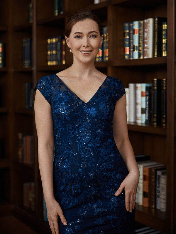 Mother of the Bride Dresses Sheath Column Tulle Applique V-neck Short Sleeves Floor-Length