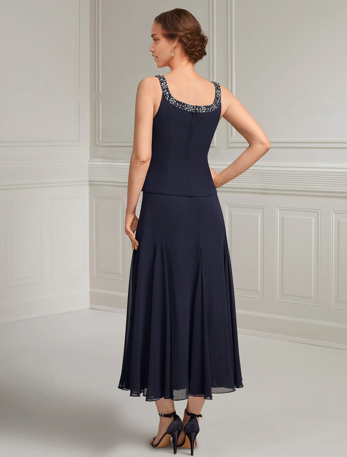 Mother of the Groom / Bride Dress A-Line 3 Piece Jewel Neck Ankle Length Chiffon Length Sleeve Beading Cascading Ruffles Solid Color Elegant Simple December Wedding Guest Dress