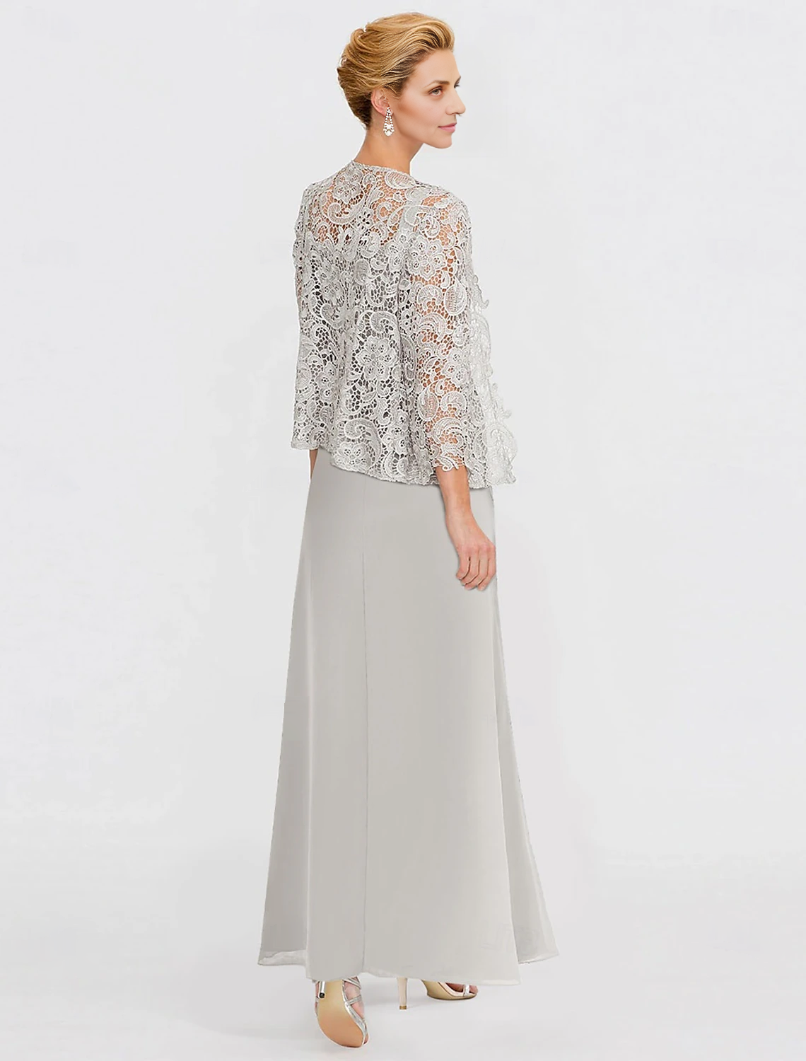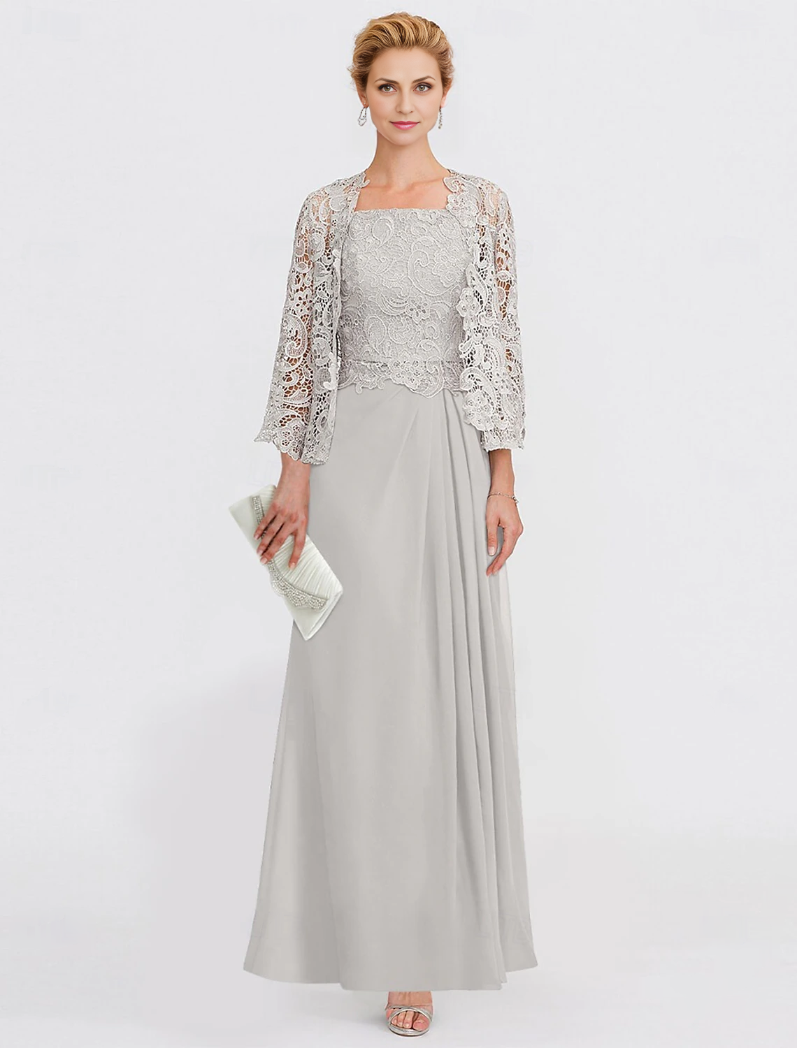 Mother of the Groom / Bride Dress A-Line Suit Straight Neckline Ankle Length Chiffon Lace Length Sleeve with Lace Side-Draped Solid Color Elegant December Wedding Guest Dress