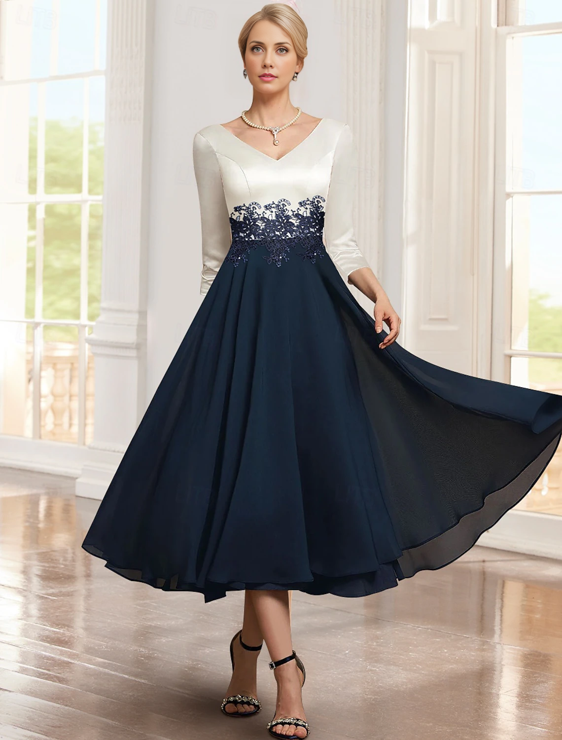 Mother of the Groom / Bride Dress V Neck Tea Length Chiffon Satin Cap Sleeve Jacket Dresses Lace Color Block Elegant December Wedding Guest Dress