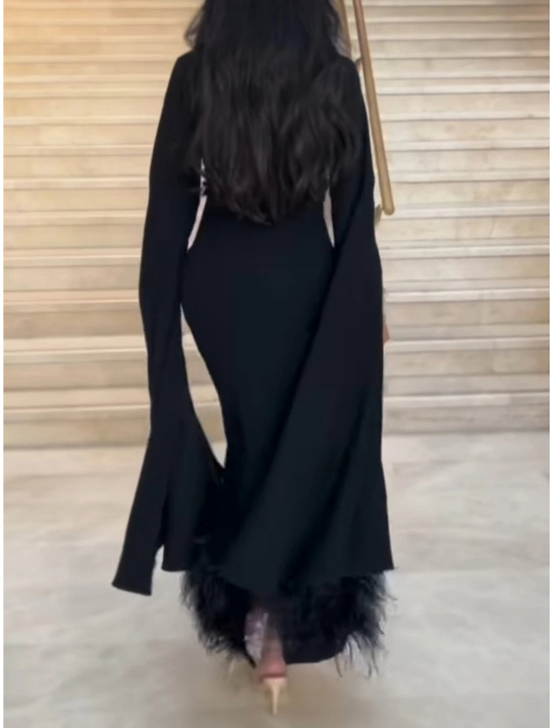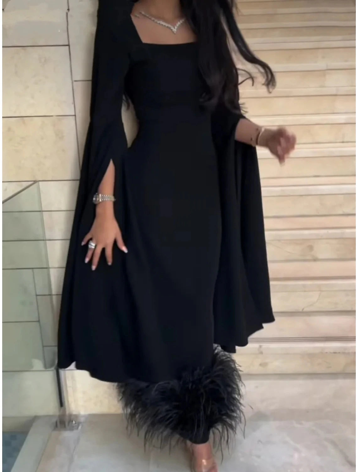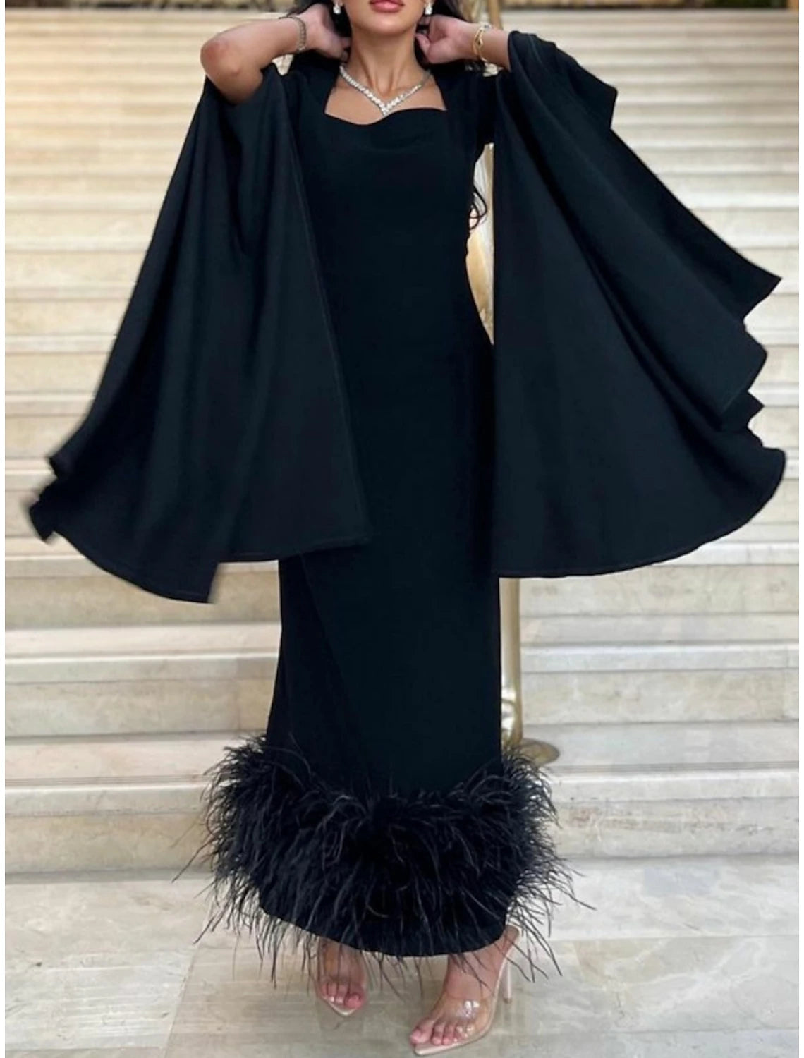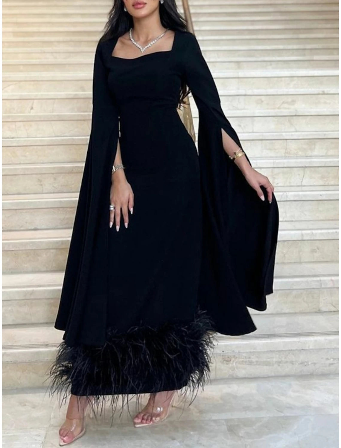 Sheath Black Dress Evening Gown Elegant Dress Formal Ankle Length Long Sleeve Square Neck Stretch Fabric with Feather