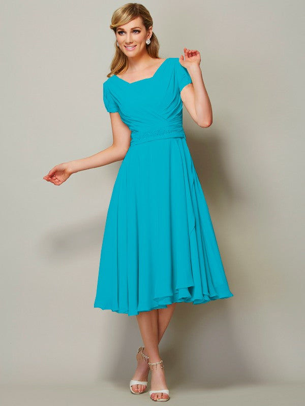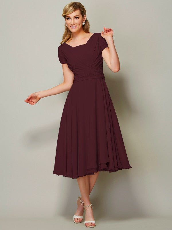 Sheath/Column Bateau Short Sleeves Ruffles Short Chiffon Tea-Length Bridesmaid Dresses