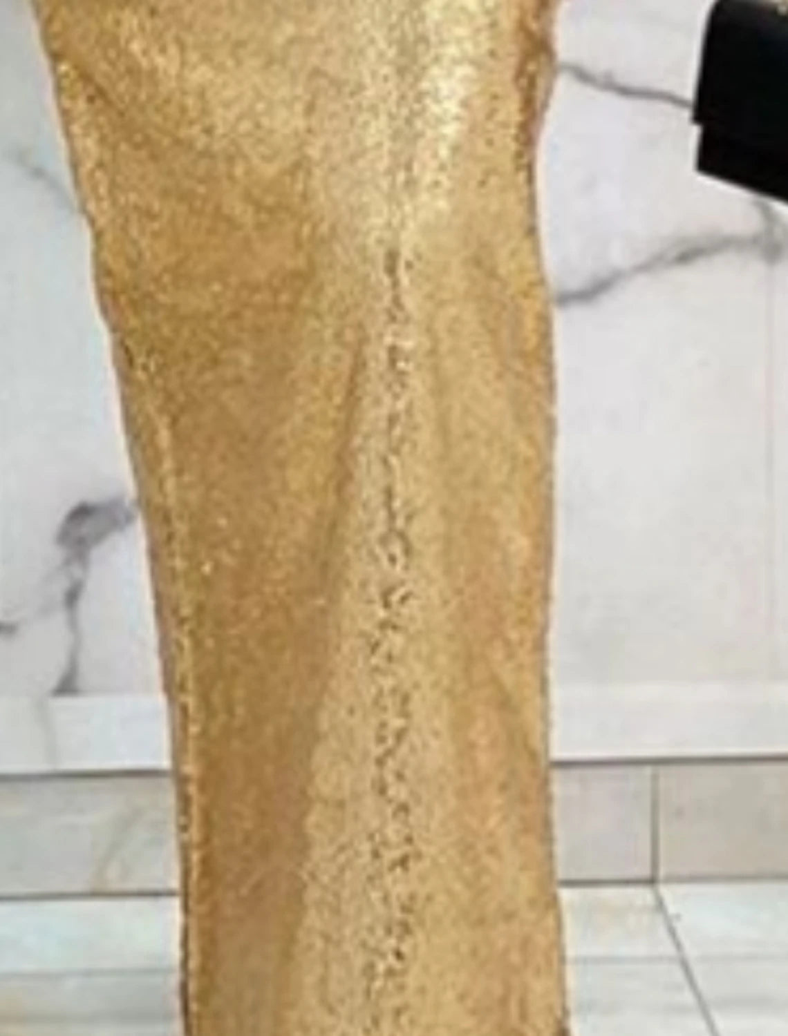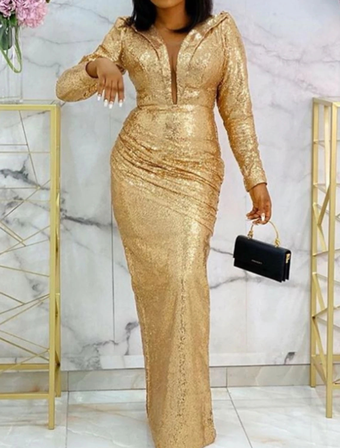 Sheath / Column Elegant Formal Evening Dress Plunging Neck Long Sleeve Floor Length Stretch Satin with Sequin