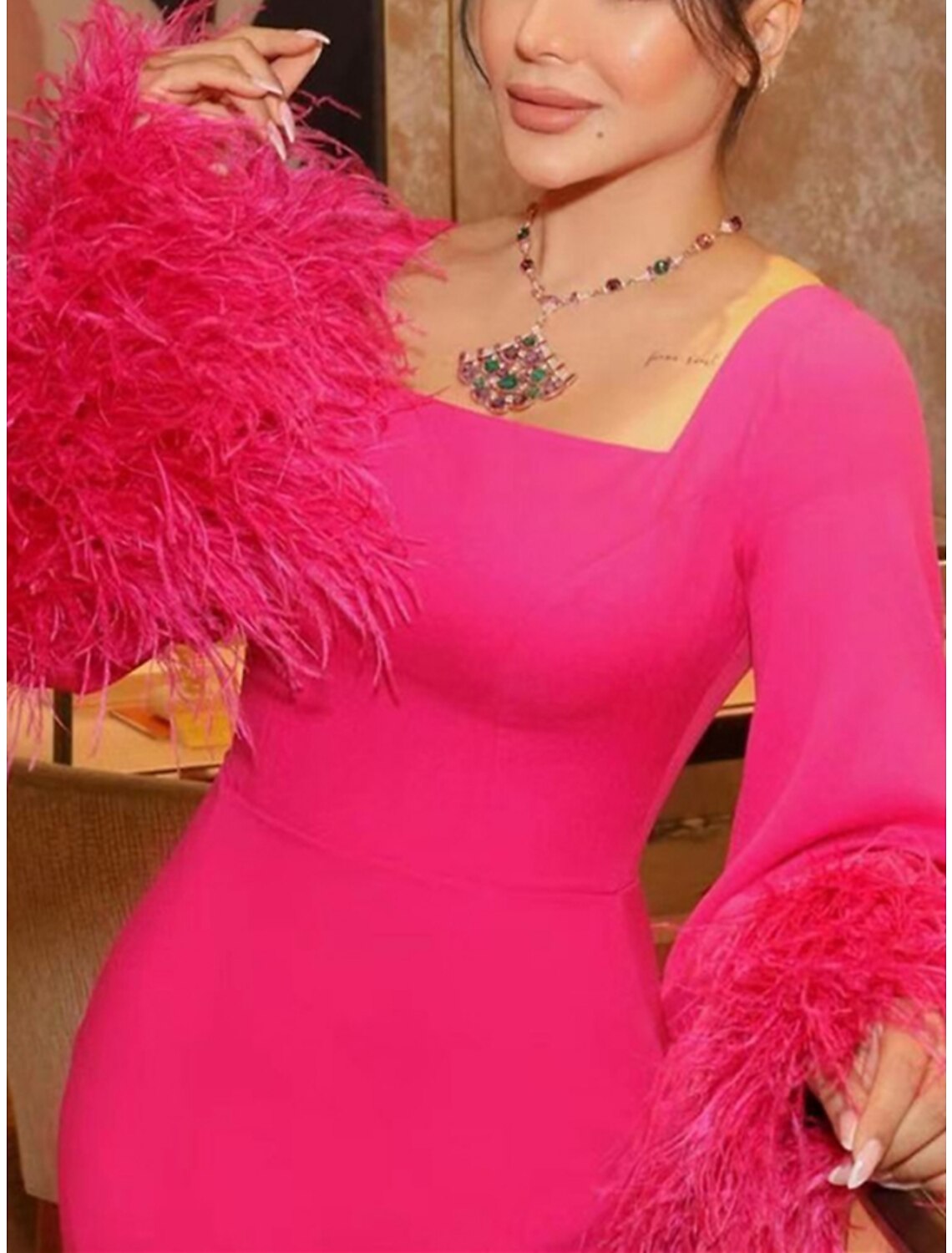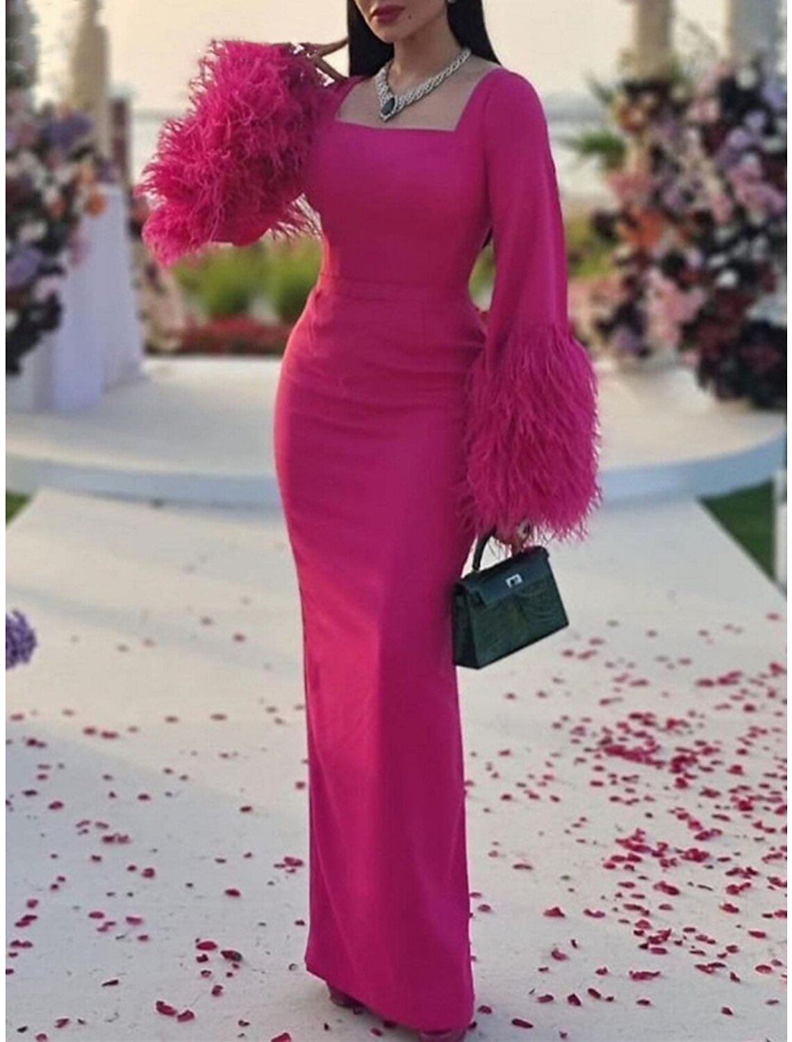 Sheath / Column Evening Gown Elegant Dress Formal Ankle Length Christmas Red Green Dress Long Sleeve Square Neck Stretch Fabric with Feather