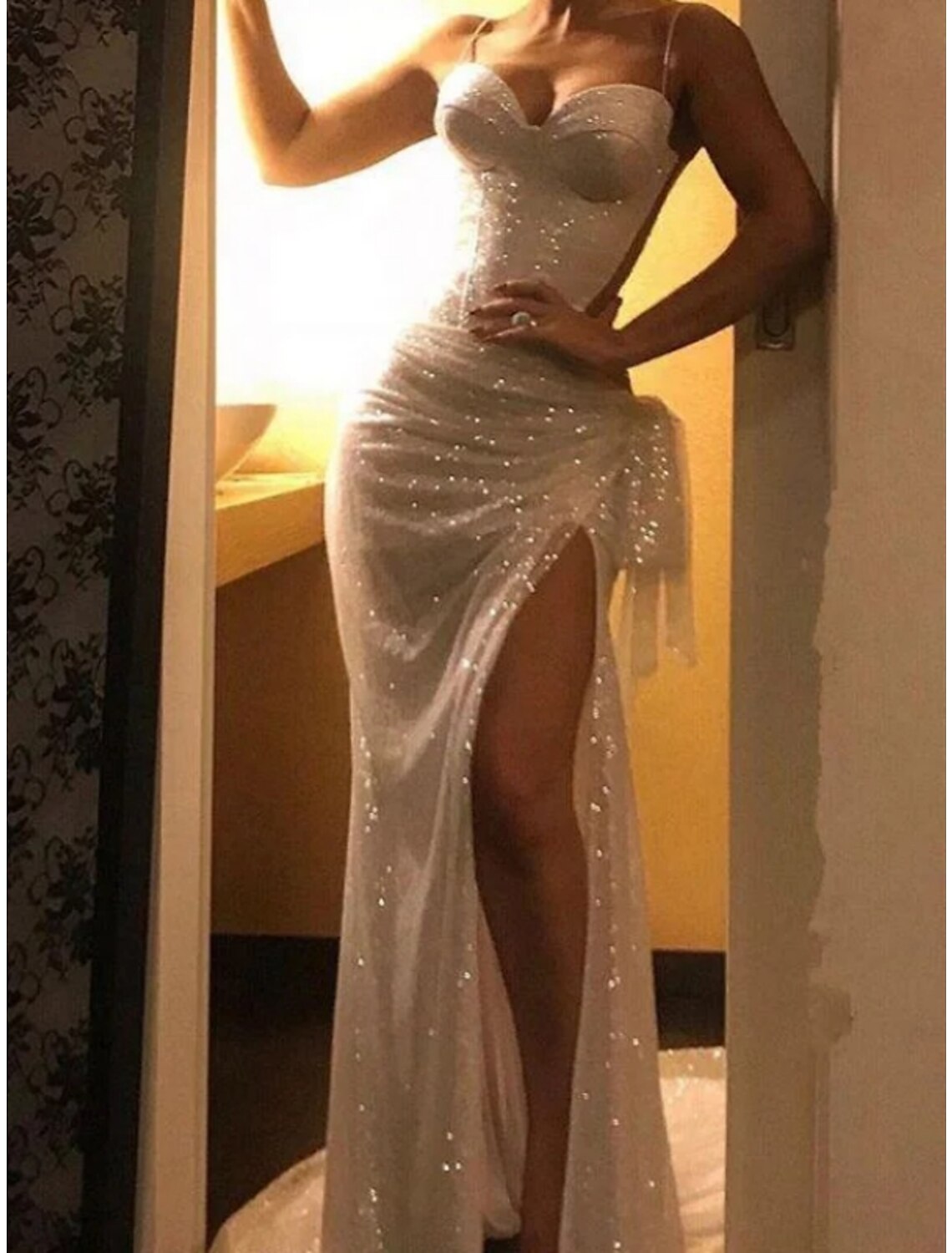 Sheath / Column Evening Gown High Split Dress Formal Wedding Guest Court Train Sleeveless Spaghetti Strap Satin with Glitter