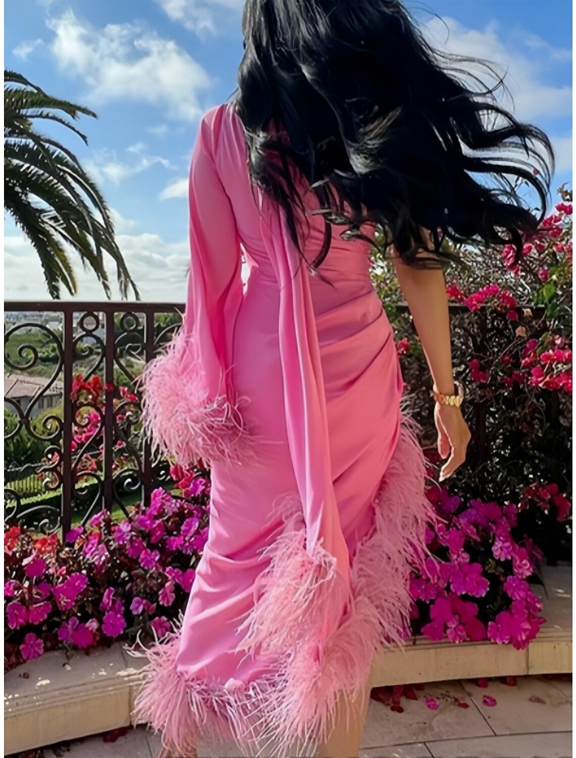 Sheath / Column Evening Gown Sexy Dress Birthday Fall Asymmetrical Long Sleeve One Shoulder Stretch Fabric with Feather Ruched