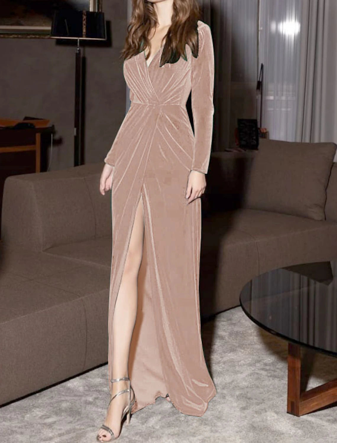 Sheath / Column Evening Gown Vintage Dress Christmas Formal Evening Floor Length Long Sleeve V Neck Fall Wedding Guest Velvet with Draping Slit