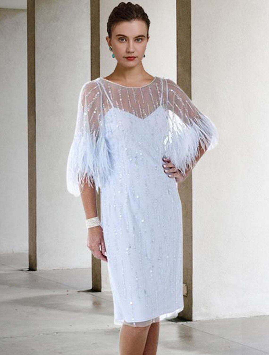 Sheath / Column Mother of the Bride Dress Fall Wedding Guest Sparkle & Shine Elegant Jewel Neck Knee Length Stretch Chiffon Half Sleeve with Feather Beading Sequin