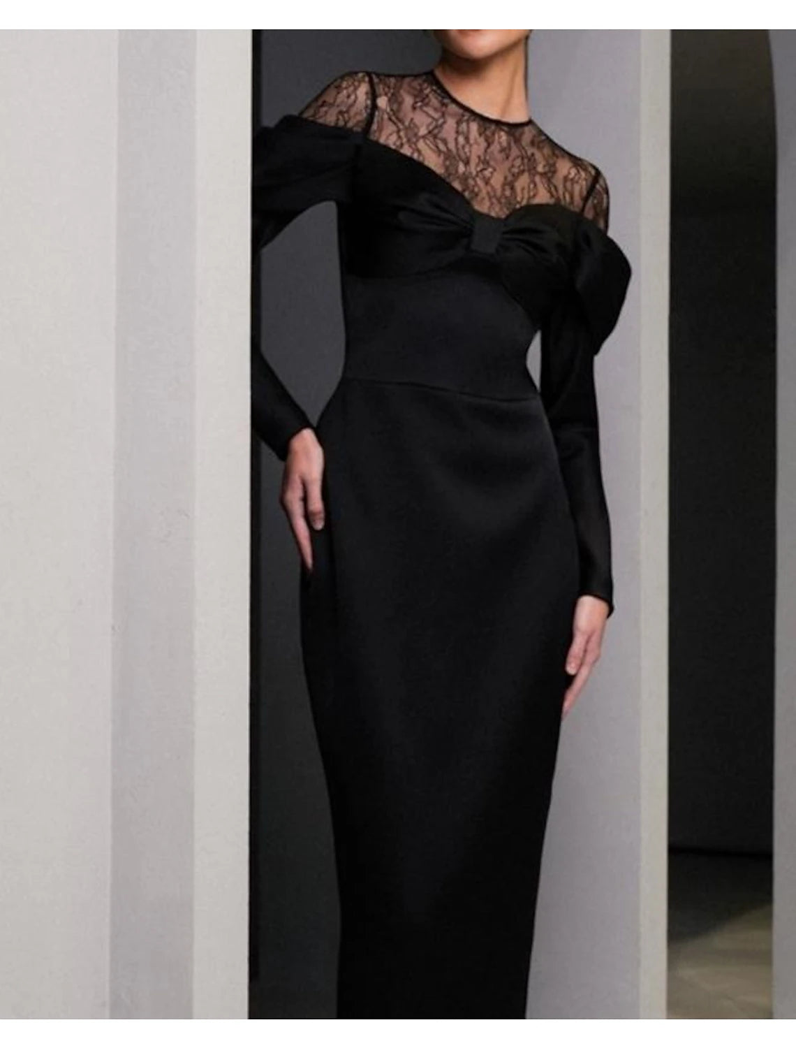 Sheath / Column Mother of the Bride Dress Formal Wedding Guest Party Elegant Scoop Neck Floor Length Satin Lace Long Sleeve with Bow(s)