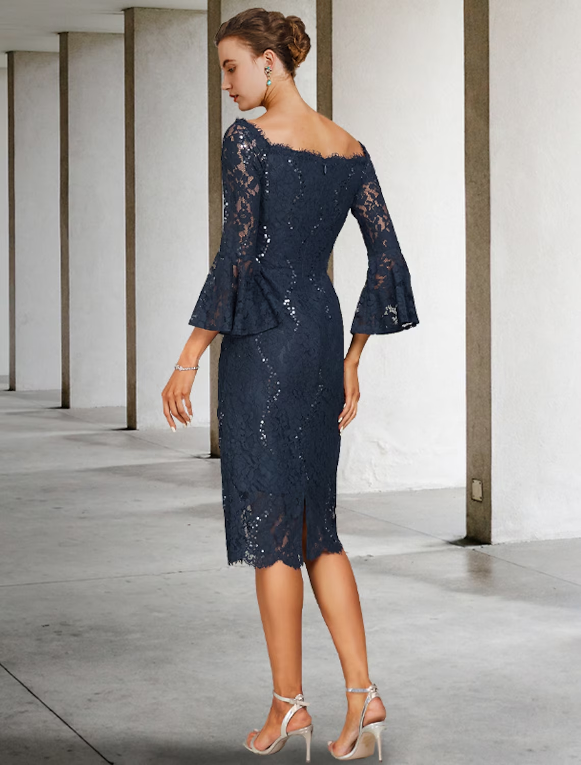 Sheath / Column Mother of the Bride Dress Vintage Elegant Jewel Neck Tea Length Lace 3/4 Length Sleeve with Sequin