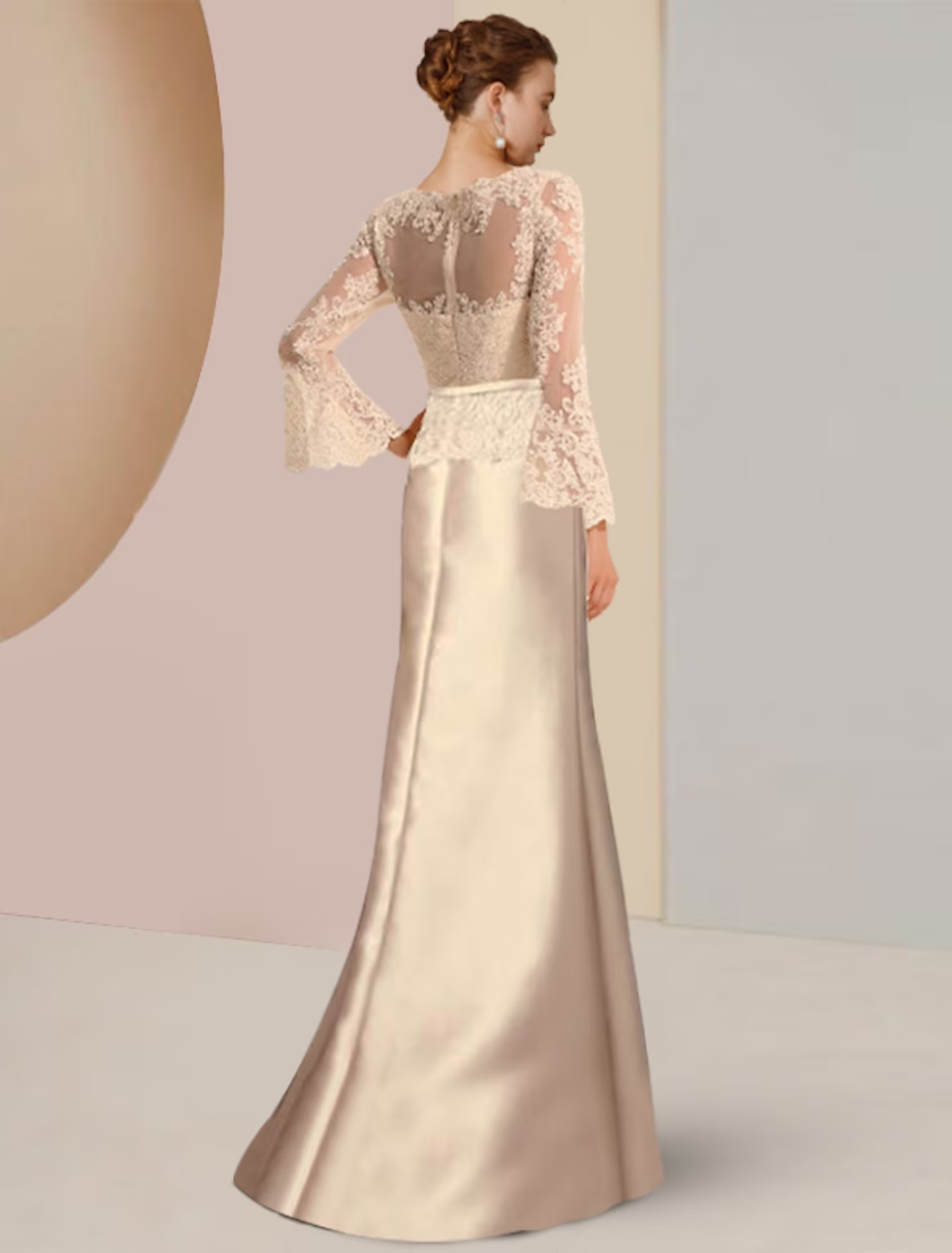 Sheath / Column Mother of the Bride Dress Wedding Guest Elegant Scoop Neck Sweep / Brush Train Satin Lace Long Sleeve with Beading Appliques
