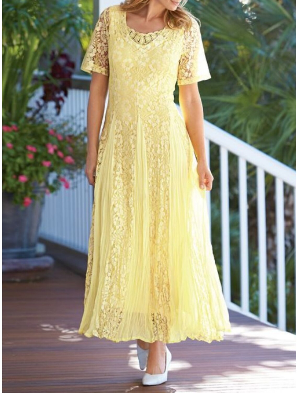 Sheath / Column Mother of the Bride Dress Wedding Guest Elegant Sweet Scoop Neck Ankle Length Chiffon Lace Short Sleeve with Pleats Solid Color