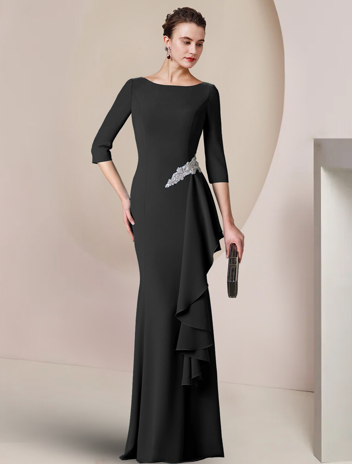 Sheath / Column Mother of the Bride Dress Wedding Guest Party Elegant Scoop Neck Floor Length Stretch Fabric 3/4 Length Sleeve with Crystal Brooch Ruching