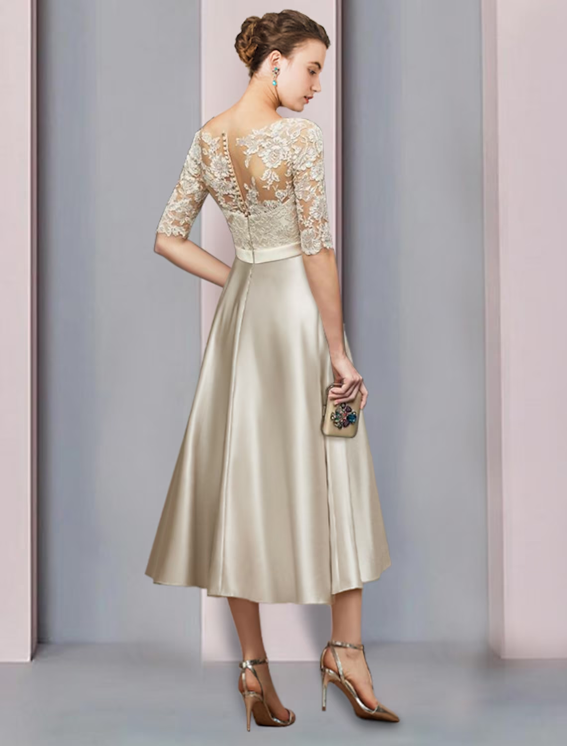 Sheath / Column Mother of the Bride Dress Wedding Guest Party Elegant Scoop Neck Tea Length Satin Lace Half Sleeve with Bow(s) Pleats