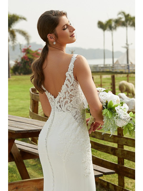 Sheath/Column Stretch Crepe Lace V-neck Sleeveless Cathedral Train Wedding Dresses