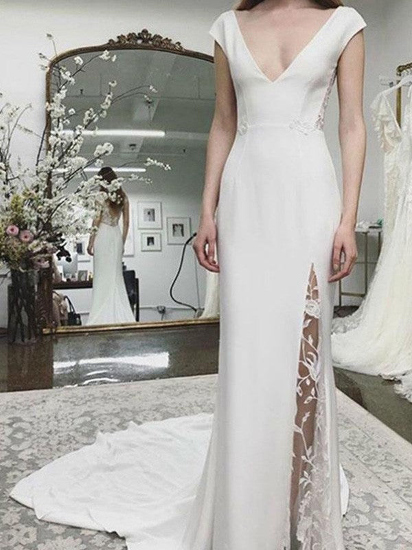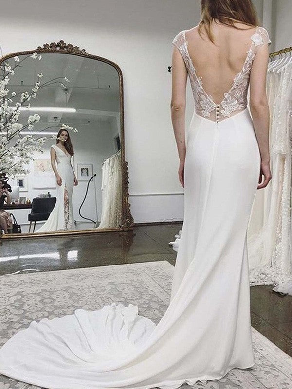 Sheath/Column Stretch Crepe Lace V-neck Sleeveless Court Train Wedding Dresses