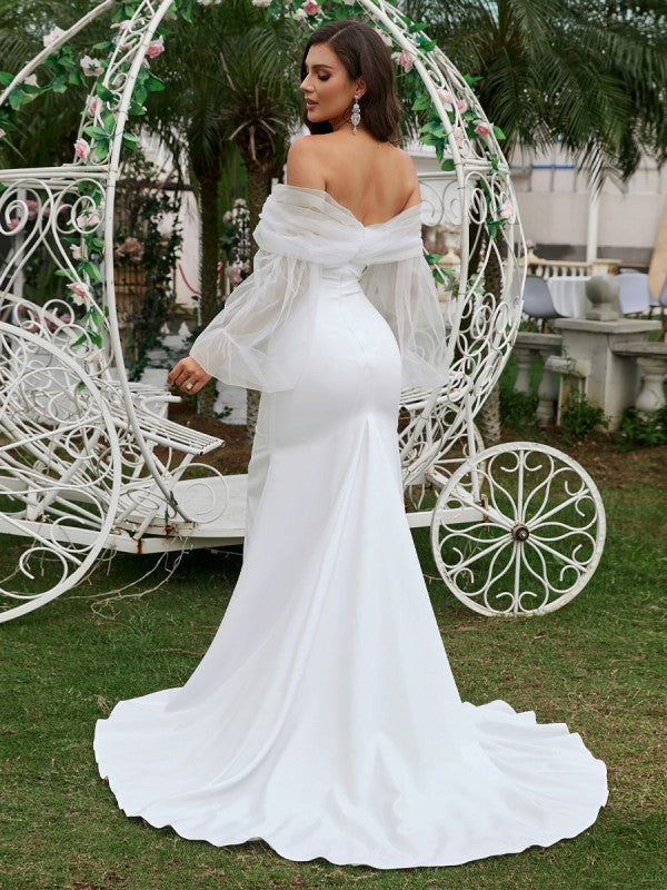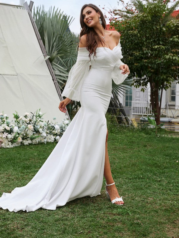 Sheath/Column Stretch Crepe Ruched Off-the-Shoulder Long Sleeves Sweep/Brush Train Wedding Dresses