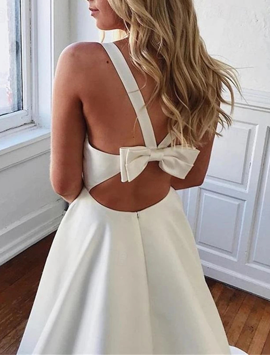 Simple A-Line V Neck Sleeveless Sweep / Brush Train Satin Wedding Dresses Bridal Gowns