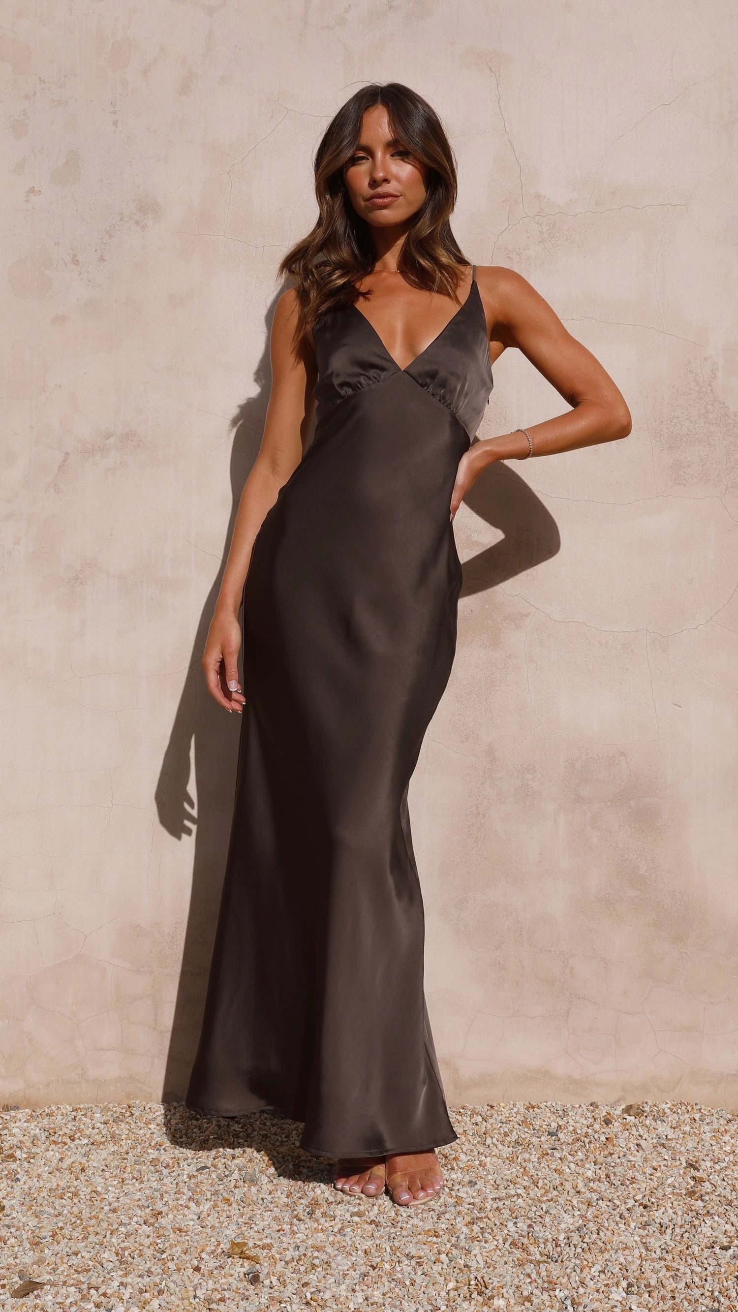 This sleek evening dress features a figure-skimming sheath silhouette, a bold deep V neckline, and delicate spaghetti straps, crafted from lustrous espresso satin. The open back adds chic allure, while the floor-length hem drapes gracefully. Perfect for galas or formal events with its modern, minimalist look.