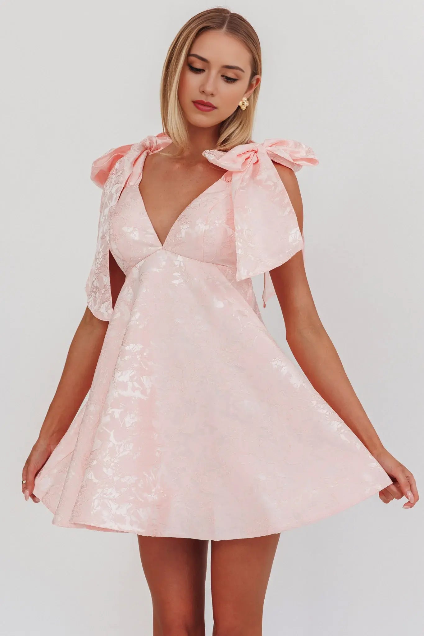 Sweet A Line V Neck Tied Shoulder Sleeveless Jacquard Blush Backless Cute Mini Dress Hot Sale Homecoming Dress